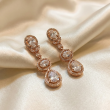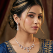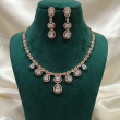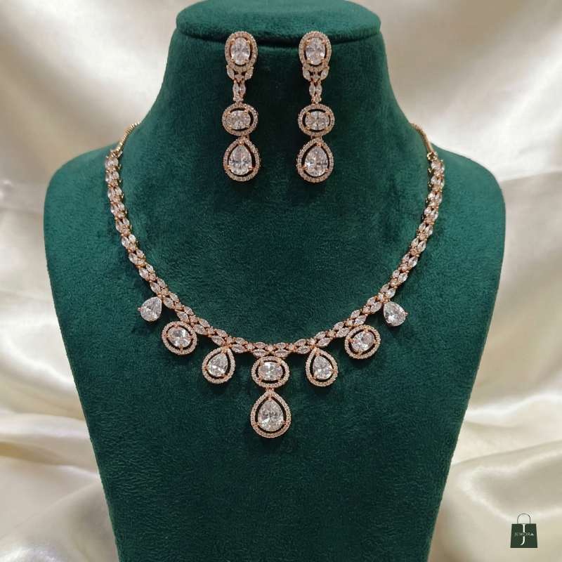 Elevate your bridal and occasion look with this breathtaking rose gold multi pear diamond necklace and matching drop earrings set. Designed with a graceful sequence of pear-shaped diamond drops framed in shimmering halos, the necklace creates a fluid, symmetrical silhouette that radiates sophistication. The coordinating earrings mirror the cascading elegance, offering refined movement and luminous brilliance. A masterpiece of craftsmanship, this set embodies opulence, femininity, and timeless luxury—perfect for weddings, receptions, and grand celebrations.