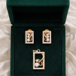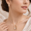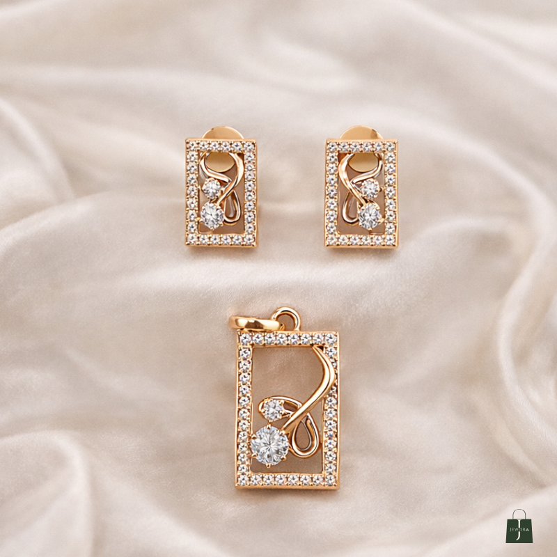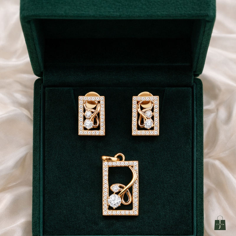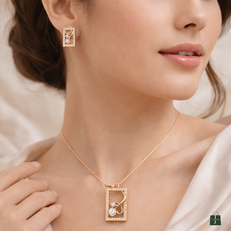 Indulge in refined sophistication with this rose gold rectangular pendant and matching stud earrings set. Framed with shimmering stones, the design highlights an artistic swirl motif embracing a radiant diamond centerpiece. The clean rectangular silhouette paired with fluid detailing creates a perfect balance of modern luxury and classic elegance. Crafted for those who appreciate understated opulence, this set is ideal for both everyday refinement and special occasions.