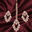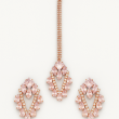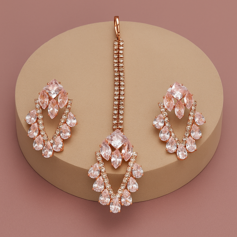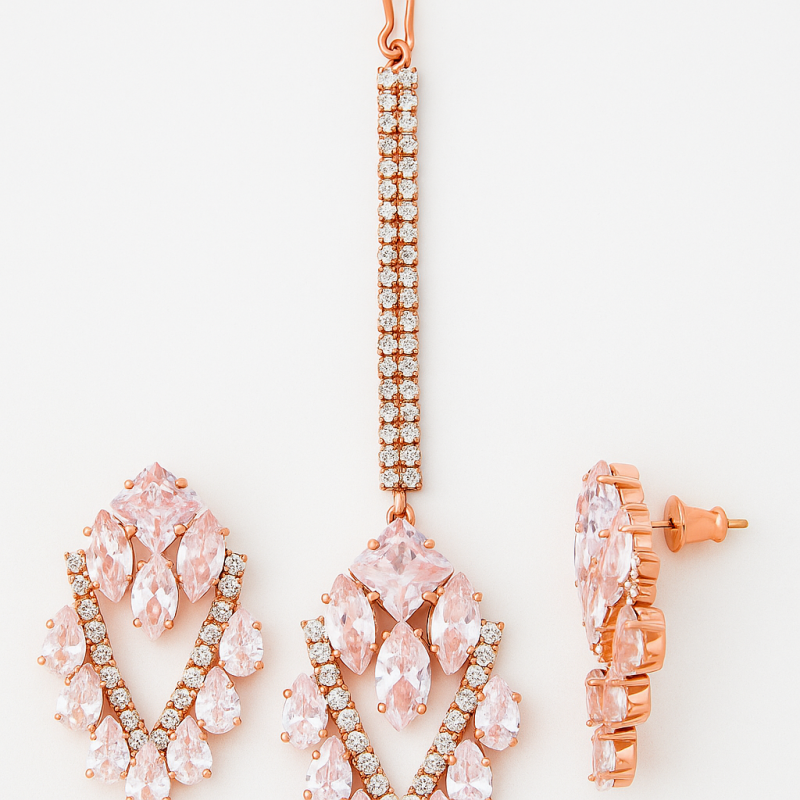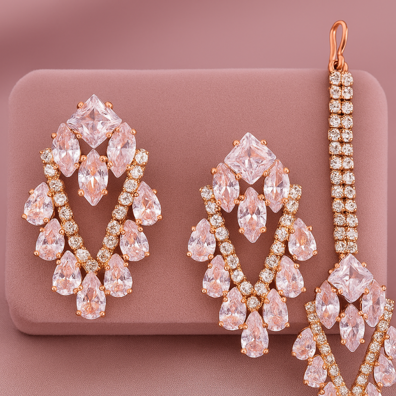 Embrace elegance and radiance with this stunning rose gold maang tikka and earrings set, crafted to perfection for bridal and festive occasions. The design showcases a beautiful arrangement of teardrop-shaped American Diamonds, set in a delicate rose gold polish that enhances its luxurious charm. The earrings mirror the maang tikka with matching sparkle, making it a perfect coordinated set for traditional wear. The shimmering stones reflect light gracefully, adding a royal sparkle to your ensemble. Whether paired with a lehenga, saree, or other ethnic attire, this set ensures you stand out with timeless grace and sophistication. A perfect choice for weddings, sangeet, or grand festive celebrations, designed to complement your beauty with finesse.