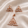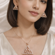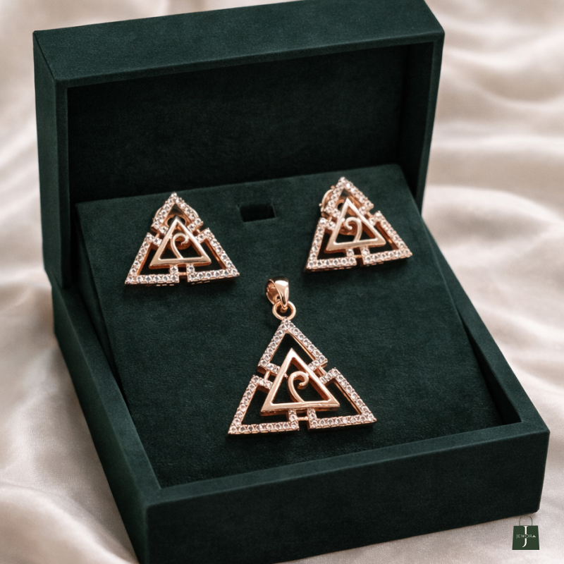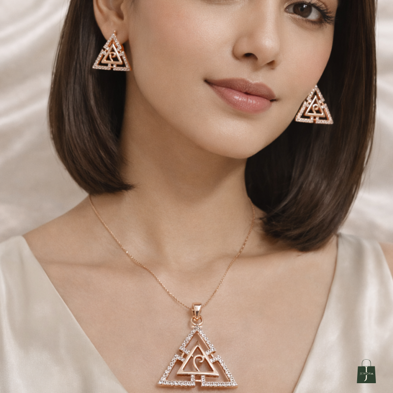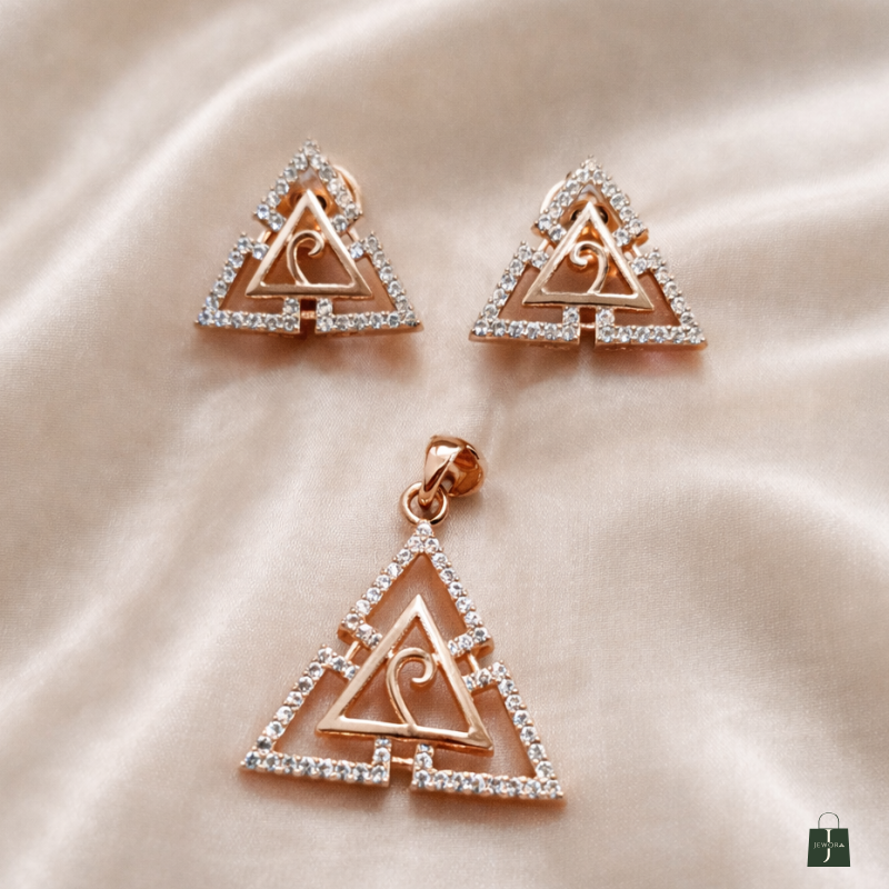 Define modern sophistication with this rose gold triple triangle diamond pendant and matching stud earrings set. Crafted with layered triangular frames, each piece is highlighted by a delicate swirl motif at the center, symbolizing harmony and balance. Brilliant stones outline the geometric silhouette, adding radiant sparkle to the contemporary design. A refined statement set created for those who appreciate architectural beauty and timeless luxury.