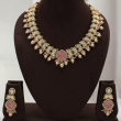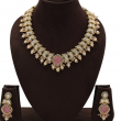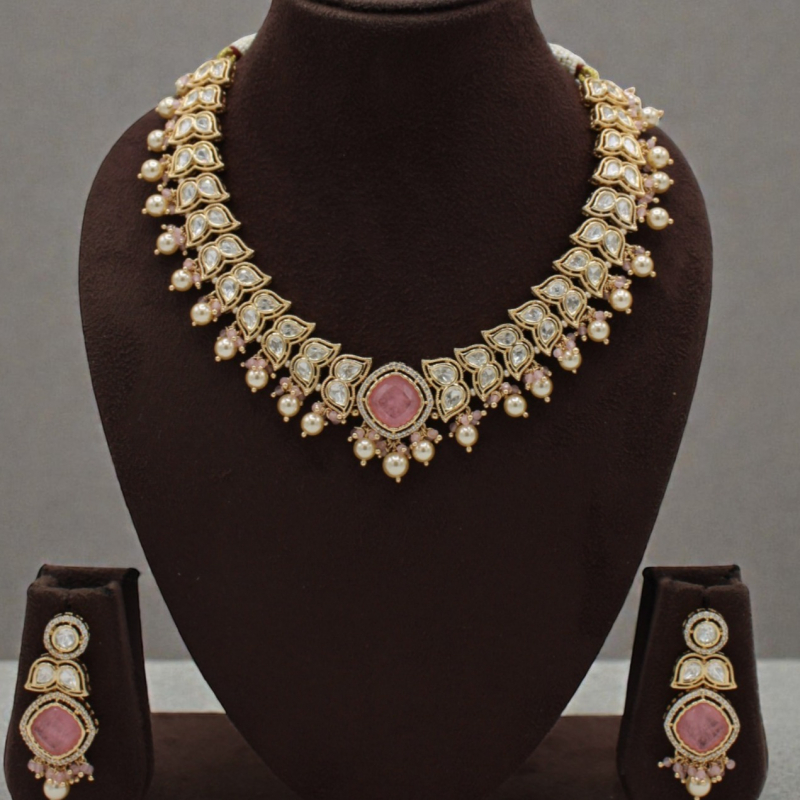 Embrace soft elegance with the Rose Pearl Polki Necklace Set, designed for those who love subtle royal charm. This graceful necklace features a continuous row of teardrop-shaped polki stones, beautifully framed in antique gold finish.