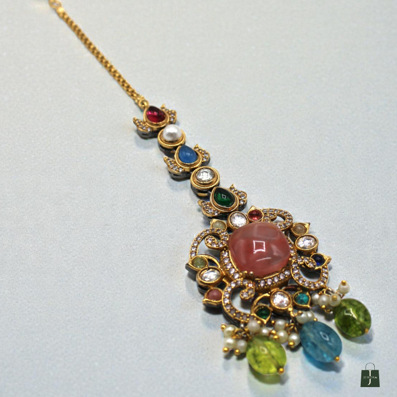 With its antique gold polish and royal detailing, this maang tikka is perfect for bridal functions, festive celebrations, and traditional ceremonies.
