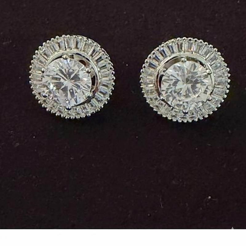 These earrings feature a brilliant round solitaire center stone, surrounded by a sophisticated double halo. The halo combines tiny round stones and precision-cut baguette diamonds, creating a high-end, multidimensional sparkle.