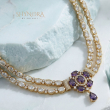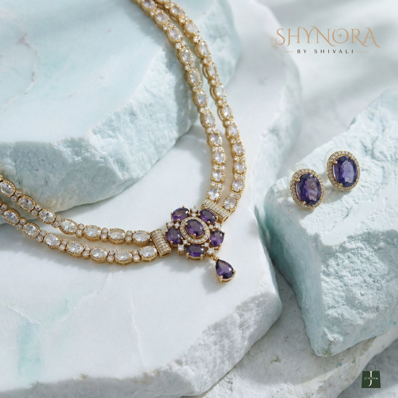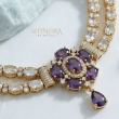 The Royal Amethyst Double-Layer Necklace Set is a graceful blend of elegance and richness, highlighted with deep purple stones. Designed with a refined double-layer of oval crystal settings, the necklace features a stunning central floral motif accented with purple amethyst-tone stones and a delicate drop pendant. The warm gold finish enhances the royal purple shade, giving it a luxurious and timeless appeal.