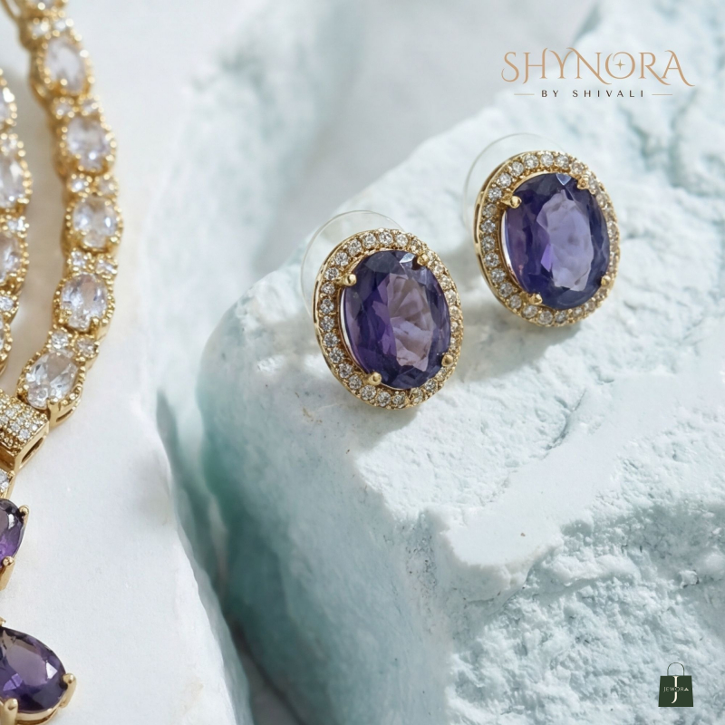 Completed with matching purple stone stud earrings, this set is perfect for weddings, festive occasions, and evening celebrations. Its sophisticated color palette makes it a standout choice for both traditional and contemporary outfits.