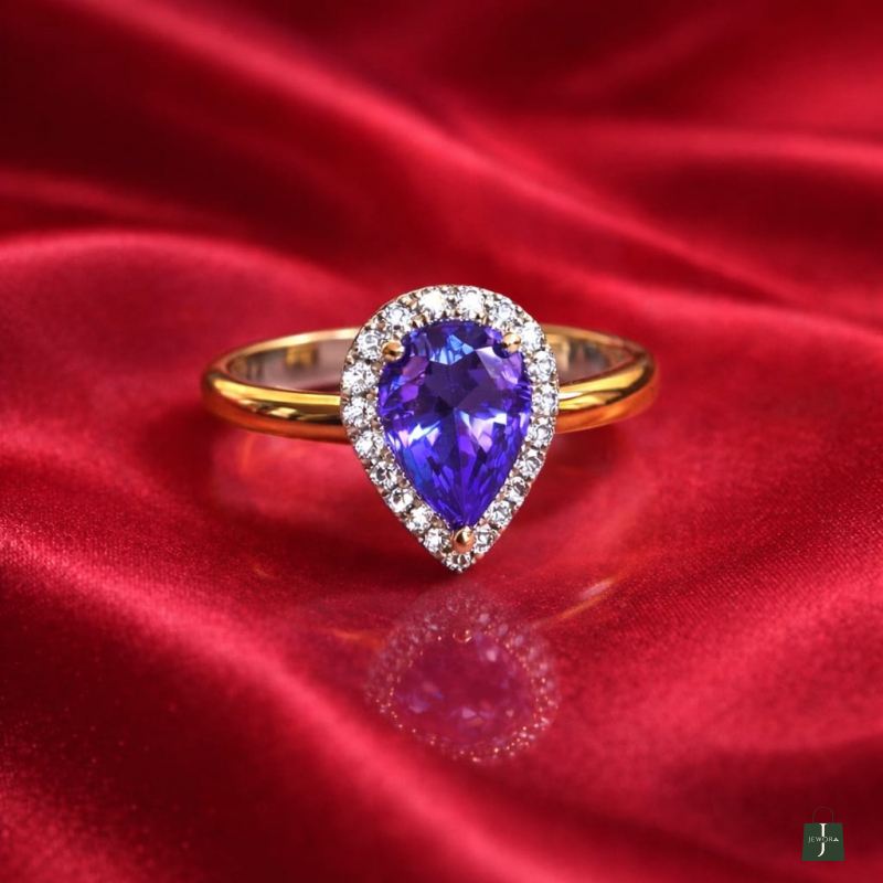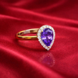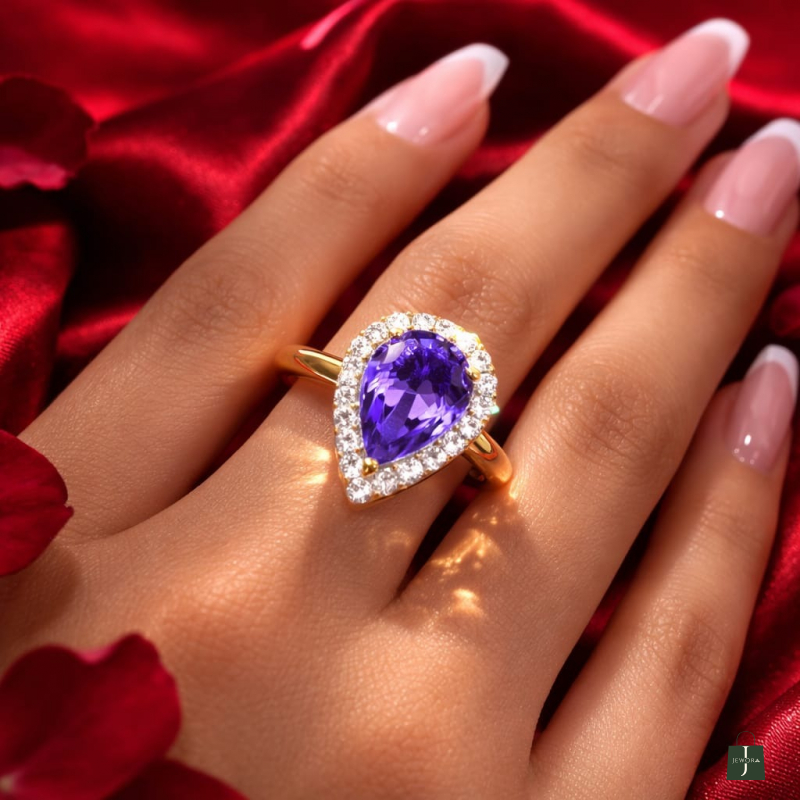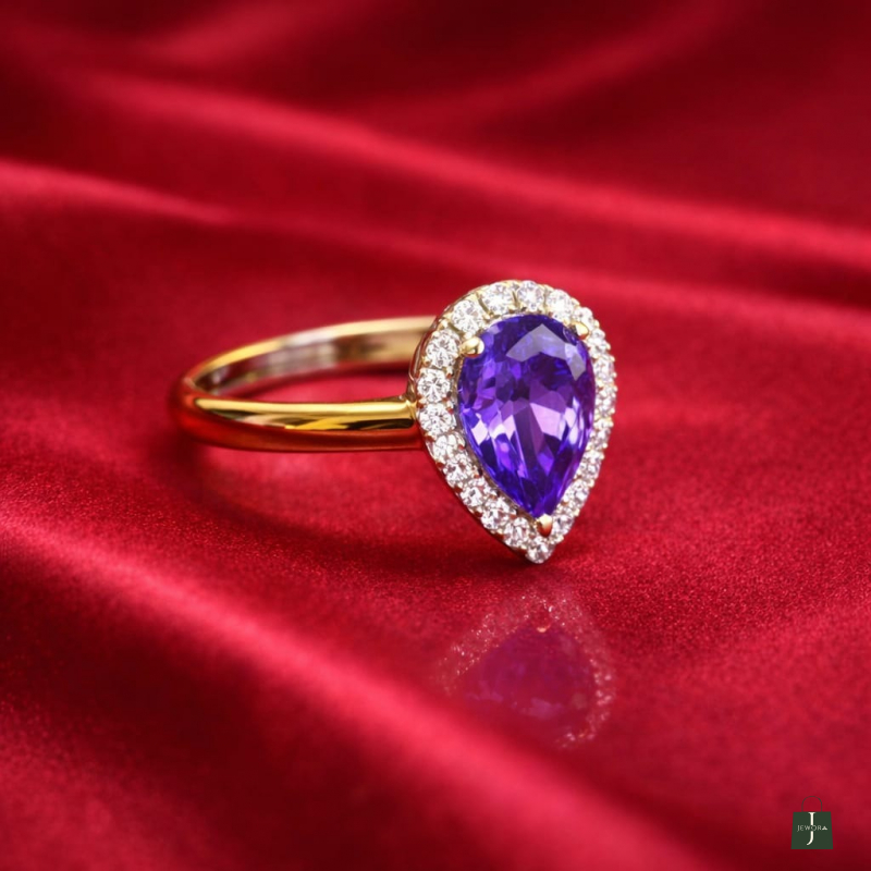 A mesmerizing pear-shaped amethyst encircled by a sparkling diamond halo, set gracefully on a polished gold band. Captured against luxurious red satin, this statement ring radiates elegance, royalty, and timeless charm. Perfect for special evenings, celebrations, or when you want your style to shine with confidence and sophistication. 💜✨