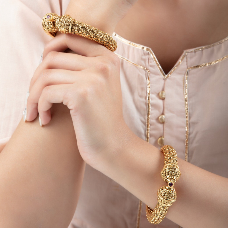 Enhance your traditional look with these beautifully crafted antique gold kada bangles. Designed with rich textured patterns and intricate carved detailing, these bangles reflect timeless craftsmanship and royal elegance. The bold cylindrical structure with ornamental end caps gives a classic temple-inspired appeal, making them perfect for festive and wedding wear. A must-have accessory to elevate any ethnic outfit.