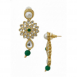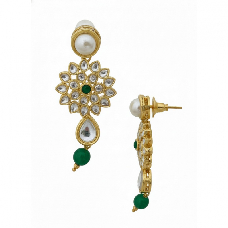 The necklace showcases a statement floral centerpiece surrounded by tear-drop Kundan stones and vibrant beads, while the coordinating earrings add a graceful finishing touch. Perfect for weddings, festivals, and special occasions, this jewelry set enhances every outfit with its royal charm and timeless beauty.