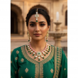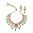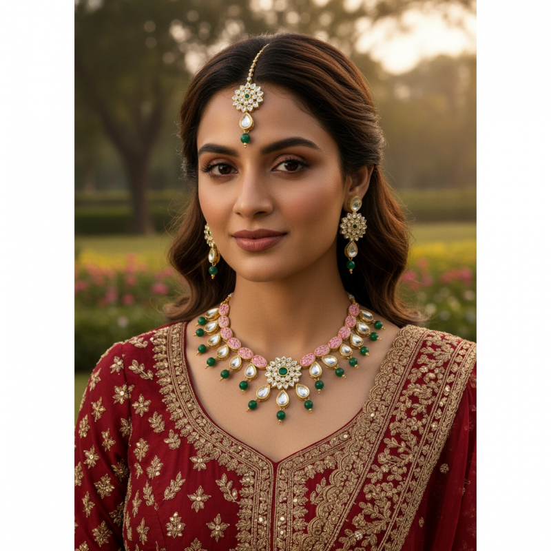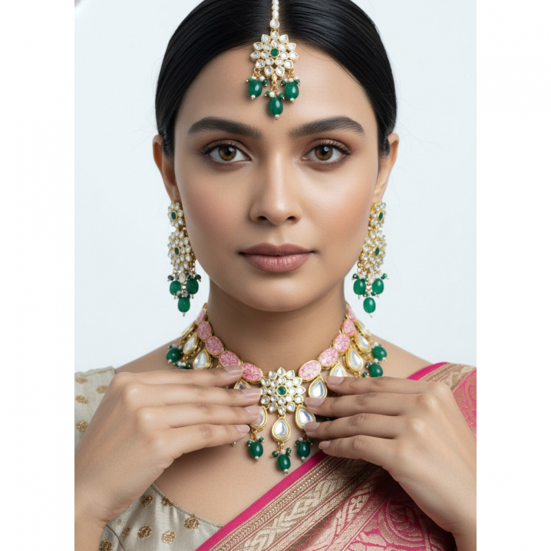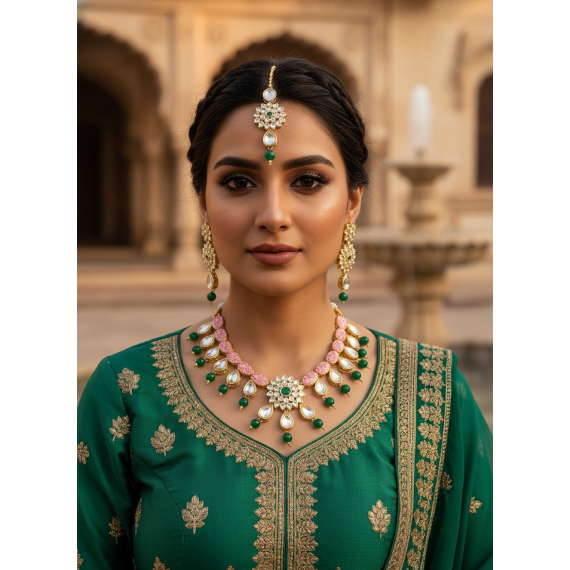 Elevate your traditional look with this exquisite Royal Blossom Kundan & Bead Bridal Jewelry Set, featuring a beautifully handcrafted necklace, matching earrings, and a stunning maang tikka. Designed with premium quality white Kundan stones, intricate pink enamel floral motifs, and rich green beads, this set blends classic artistry with modern elegance.