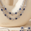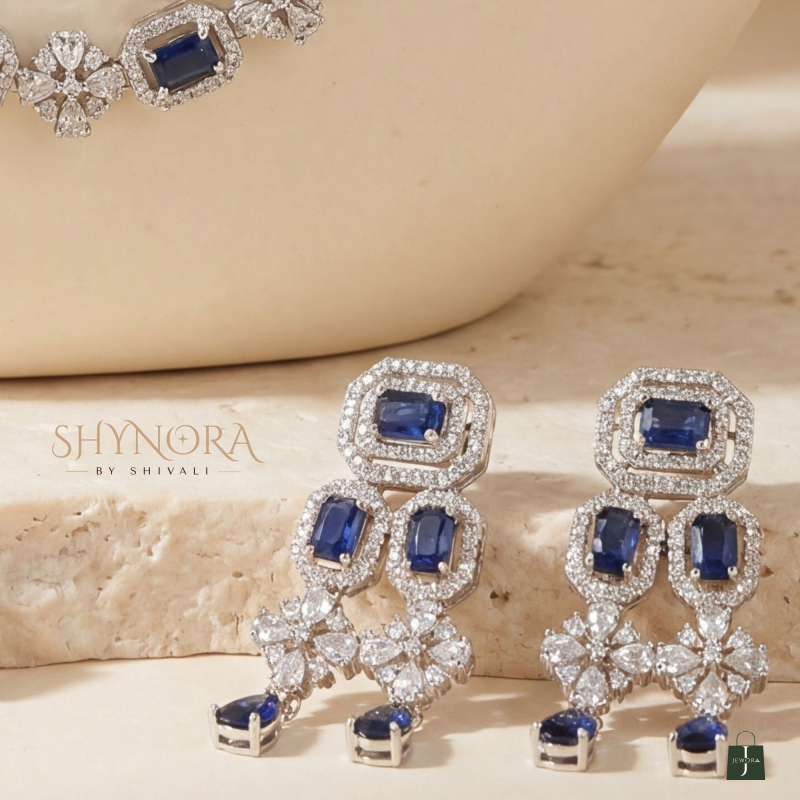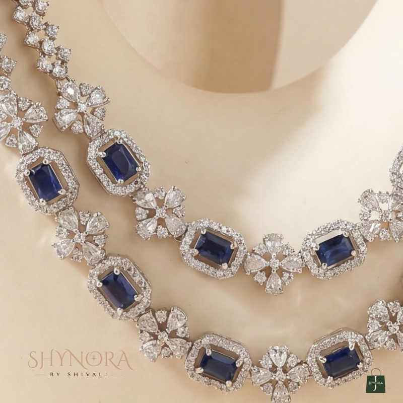 Elevate your occasion look with this elegant royal blue layered necklace set, exquisitely crafted in a sparkling AD (American Diamond) finish. The double-layered necklace features deep blue rectangular-cut stones, gracefully placed between shimmering floral diamond-style motifs for a refined and luxurious appeal.