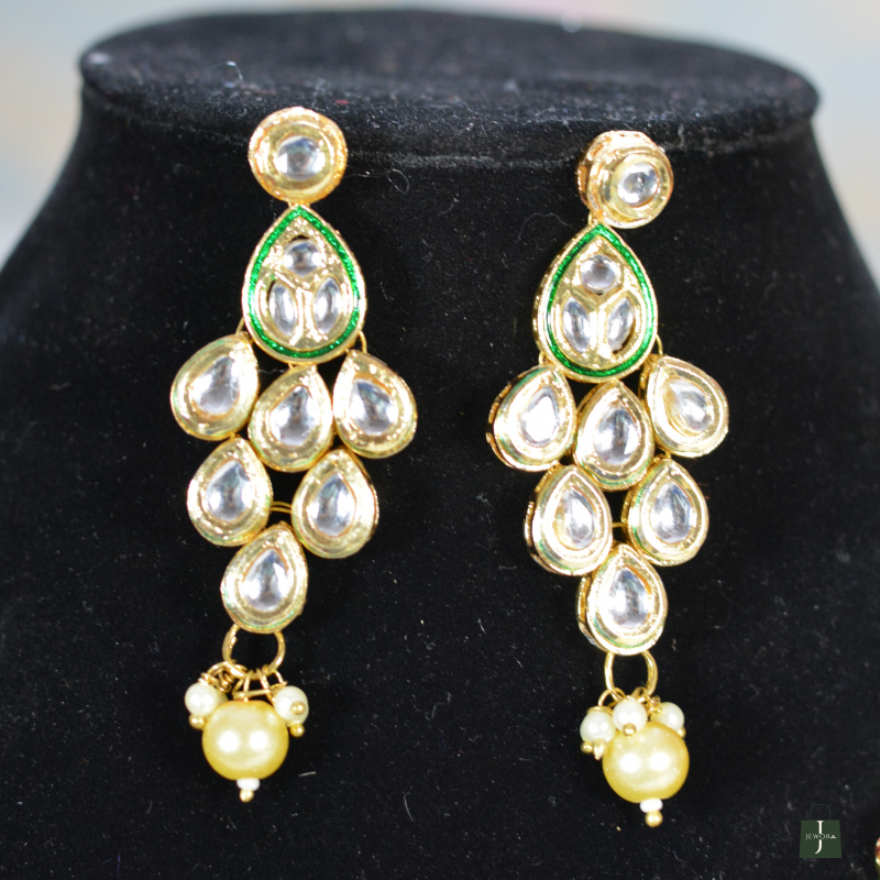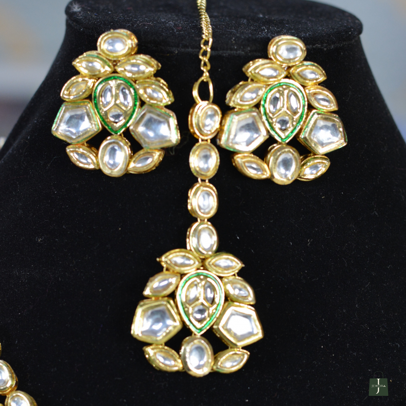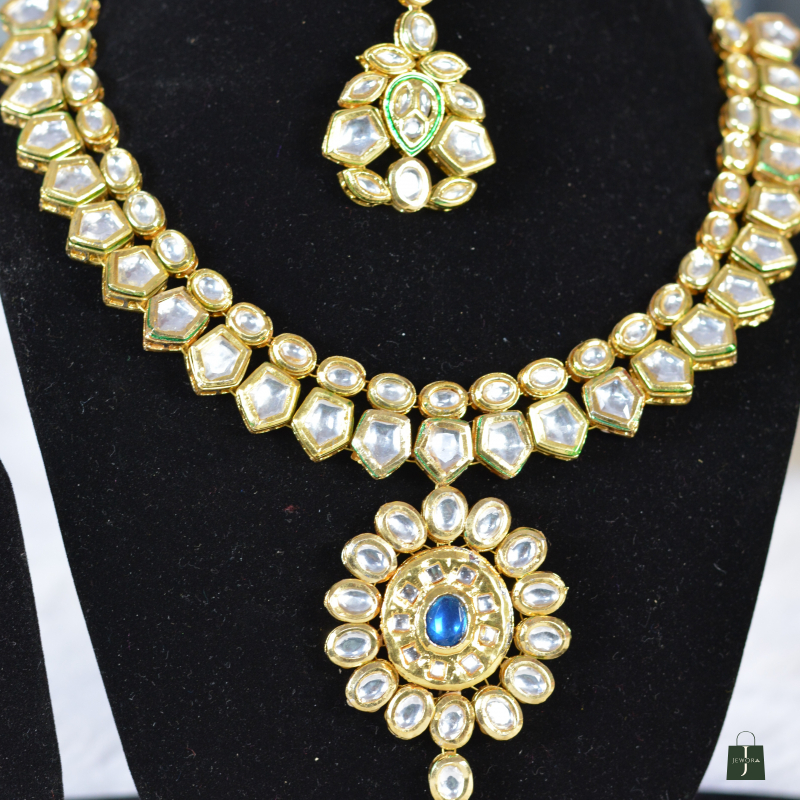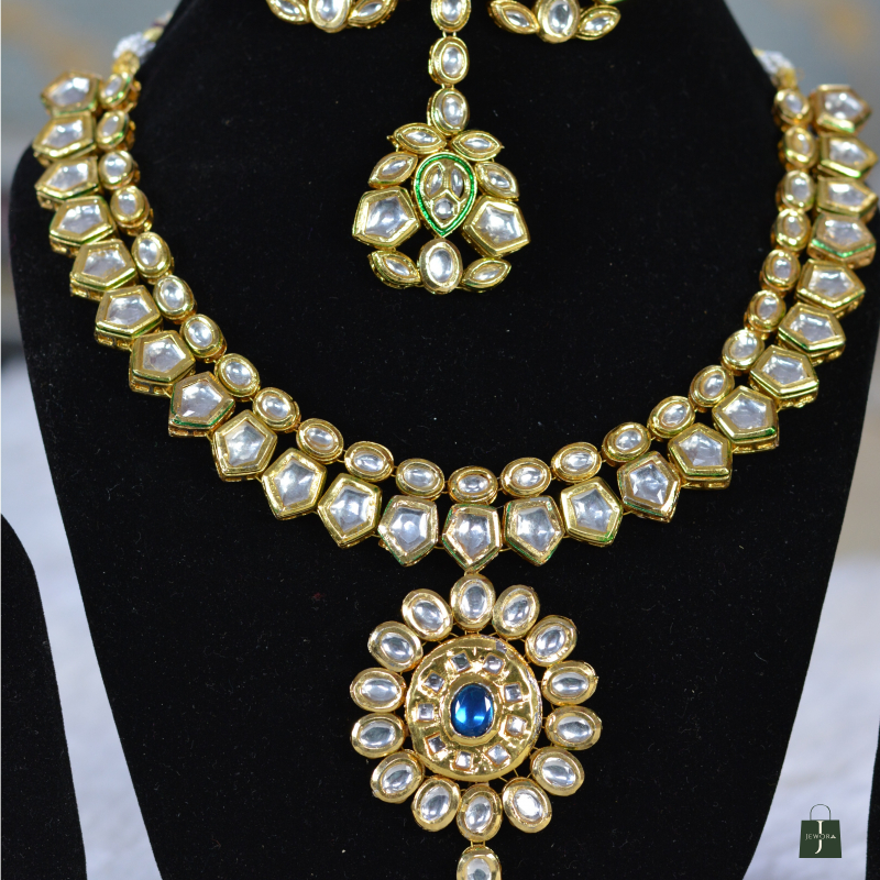 A striking Kundan jewelry set highlighted by a royal blue centerpiece stone surrounded by shimmering Polki work. The contrast of colors enhances its premium look, while the matching earrings maintain symmetry and elegance. Ideal for weddings, festive occasions, and statement styling.