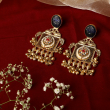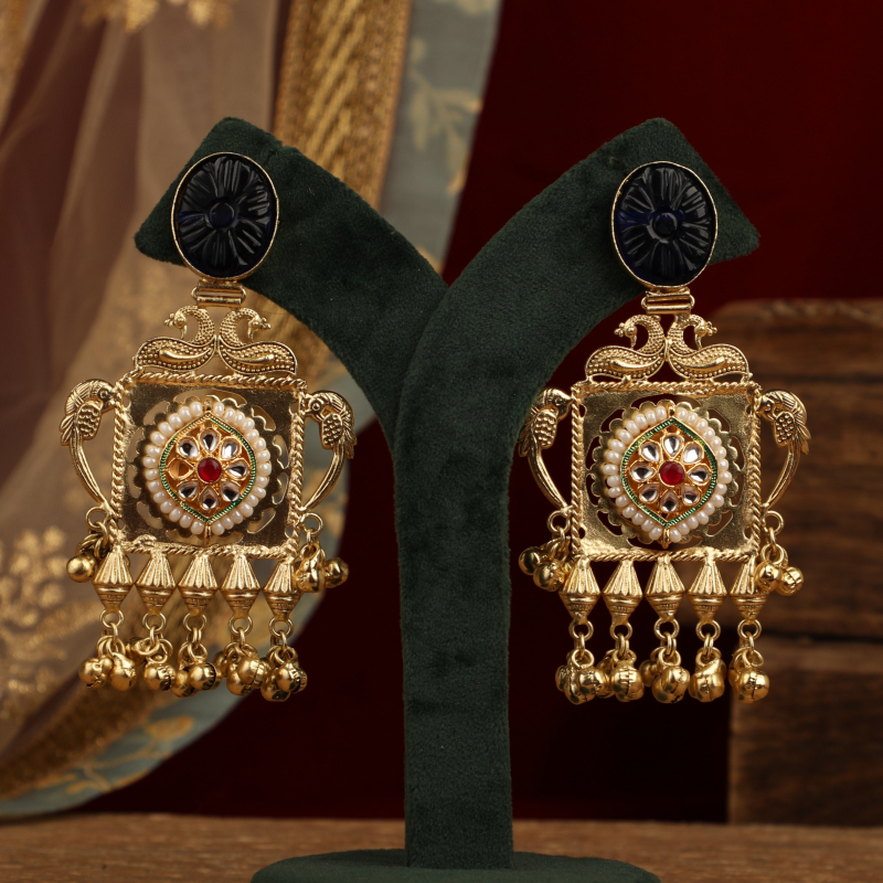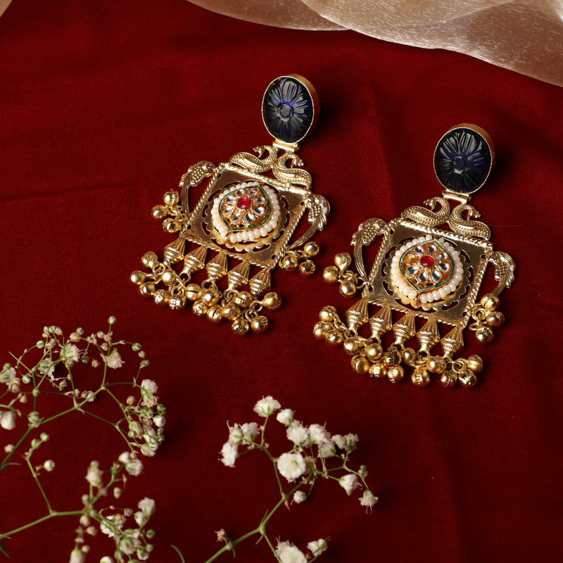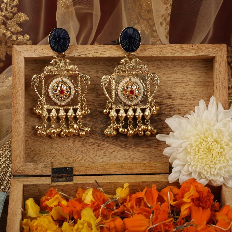 Make a striking statement with these intricately handcrafted statement earrings, inspired by royal Indian artistry. Featuring a deep blue carved stone stud at the top, the design flows into an ornate gold-tone panel adorned with classic Kundan stones, delicate pearl accents, and a bold red center highlight. The lower edge is finished with layers of ghungroo-style beads, adding movement, texture, and a rich festive charm.