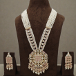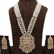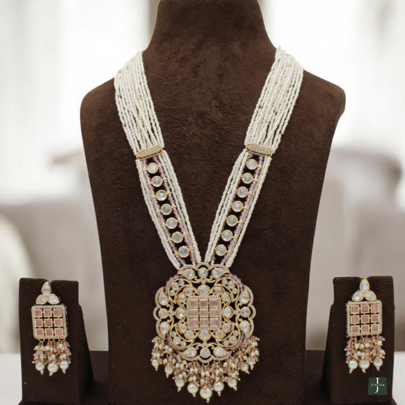 The matching statement earrings mirror the pendant design, completing the royal ensemble. Perfect for weddings, receptions, engagements, and festive celebrations, this set blends traditional heritage artistry with a contemporary soft blush tone for a sophisticated look.