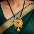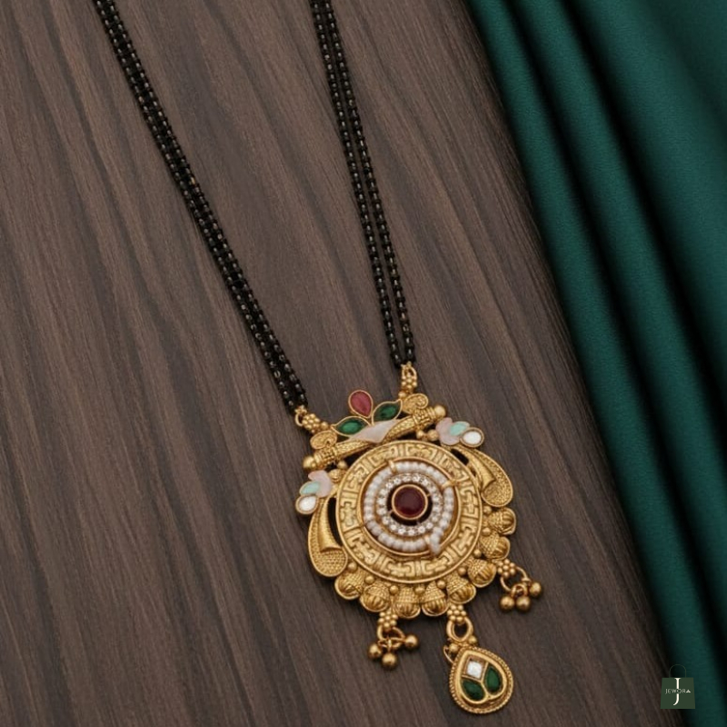 Elevate your traditional look with this beautifully designed Royal Chakra mangalsutra necklace. The pendant features a circular antique-inspired design with intricate engraved patterns and a striking ruby-red center stone surrounded by a delicate pearl halo. The upper detailing is enhanced with green and red stone accents, while elegant gold bead danglers add graceful movement. Paired with a classic double-line black beaded chain, this piece blends timeless tradition with royal charm — perfect for weddings, festive occasions, and special celebrations.