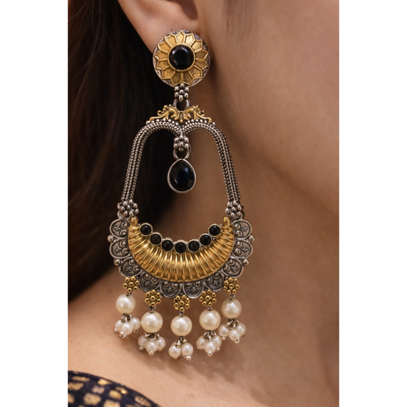 These beautifully handcrafted Chandkaar earrings from Auravelle feature a stunning crescent design adorned with intricate detailing, rich ruby-toned stones, and elegant pearl drops. The blend of antique silver and gold finish gives it a timeless, regal charm.