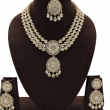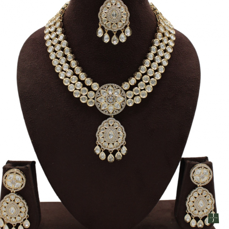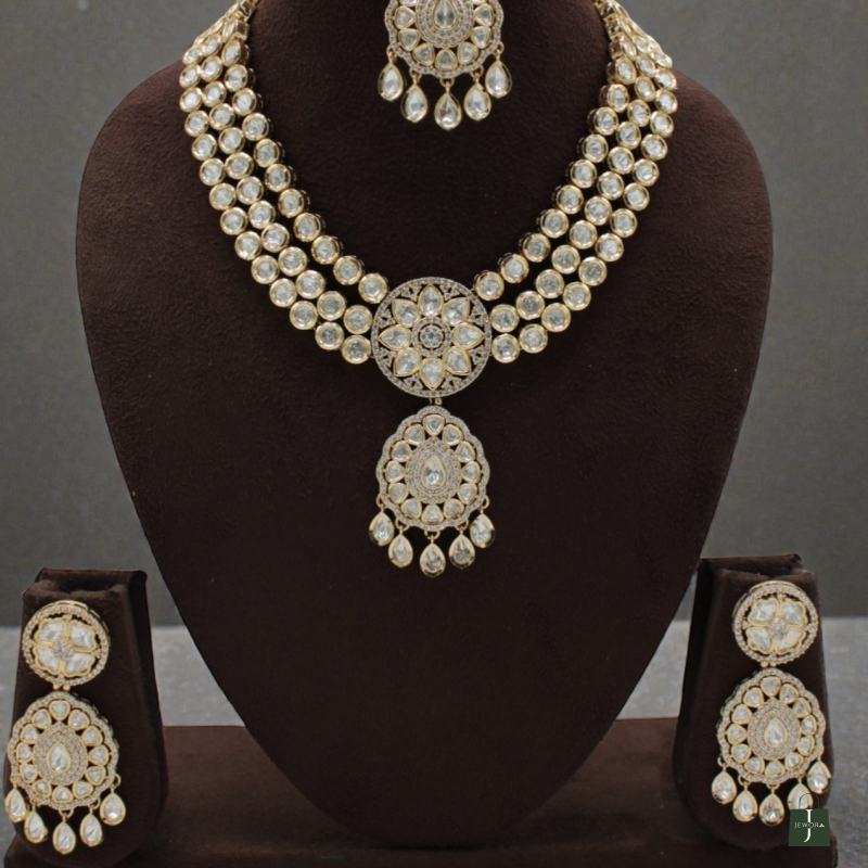 Step into timeless royalty with this Royal Double-Layer Polki Pendant Bridal Set, crafted to elevate your bridal and festive look. The necklace features two graceful layers of round Polki-style stones, arranged to create a rich and symmetrical design.