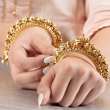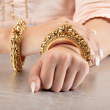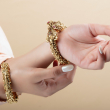 Make a bold royal statement with this exquisite pair of antique gold kada bangles, featuring intricately carved elephant head motifs at the ends. Designed with detailed temple-style craftsmanship, these kadas reflect heritage elegance and traditional artistry. The rich texture and fine carvings throughout the band enhance its luxurious appeal, while subtle stone accents add a hint of color. Perfect for weddings, festive occasions, and bridal wear, these kadas are a timeless addition to your ethnic jewellery collection.