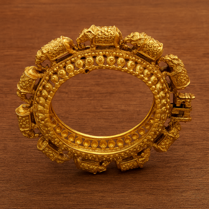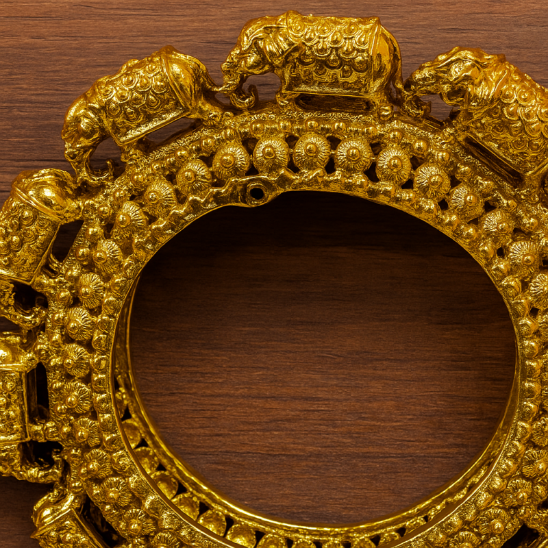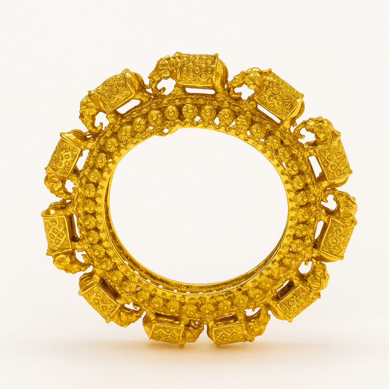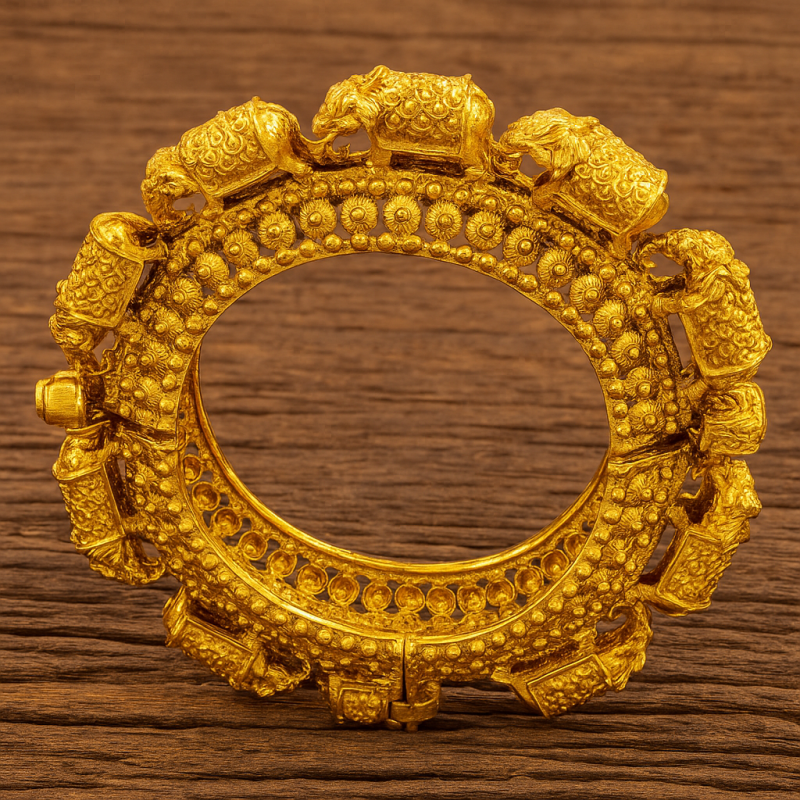The Royal Elephant Carving Temple Kada is a striking piece of jewelry that celebrates traditional artistry. Featuring finely detailed elephant carvings, it symbolizes wisdom, prosperity, and heritage. Crafted from premium alloy and finished with a rich gold polish, this kada highlights temple-style craftsmanship with intricate floral engravings and ornamental textures. The secure screw closure ensures durability and ease of wear. Perfect for festive gatherings, cultural celebrations, and bridal ensembles, this kada adds a majestic charm to any jewelry collection.