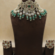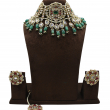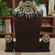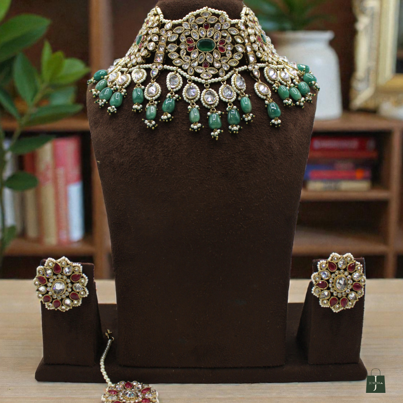 Make a majestic bridal statement with this breathtaking Kundan Choker Set, crafted with intricate floral motifs and luxurious detailing. The choker features a grand circular centerpiece adorned with white kundan stones, ruby-red accents, and a striking emerald green center stone.