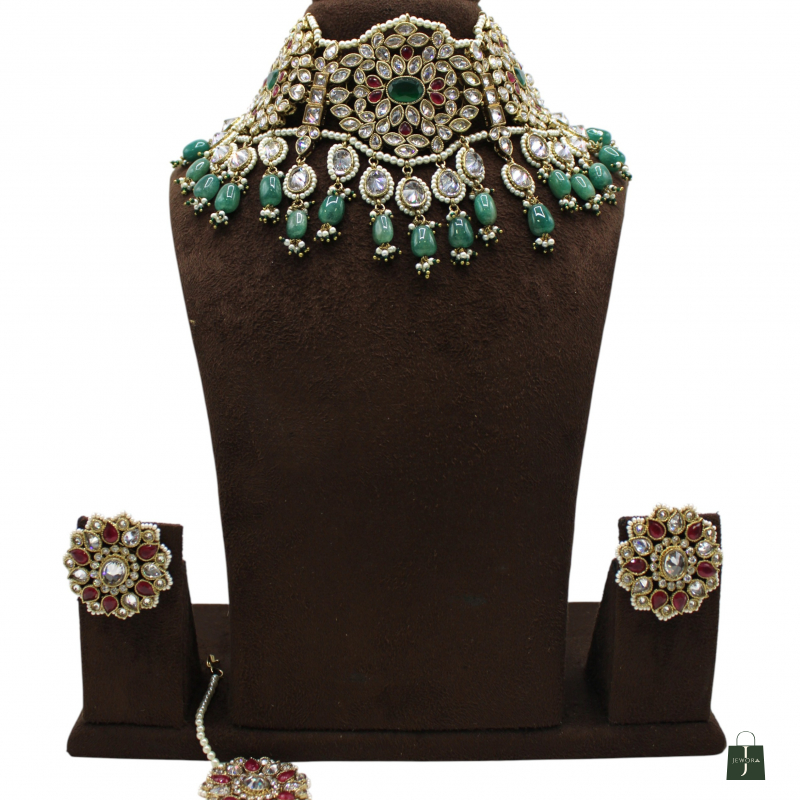 Delicate pearl lining enhances the upper edge, while elegant green bead danglers and kundan drops create a rich cascading effect. This set includes matching statement earrings and a coordinating maang tikka, making it a complete bridal jewellery ensemble.