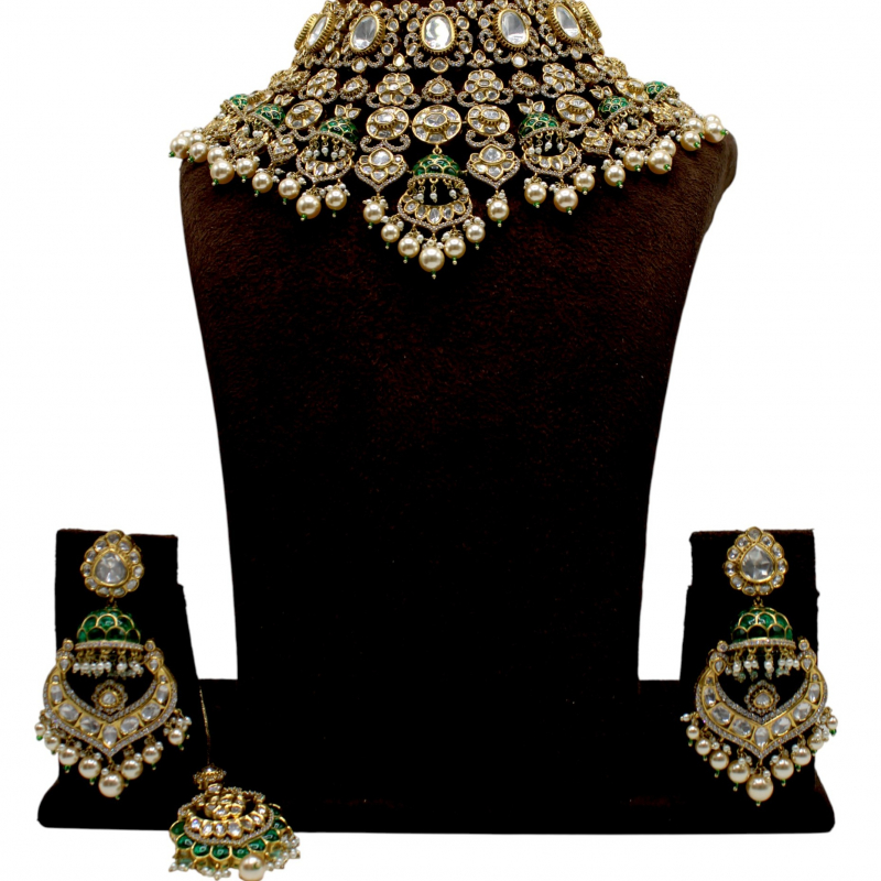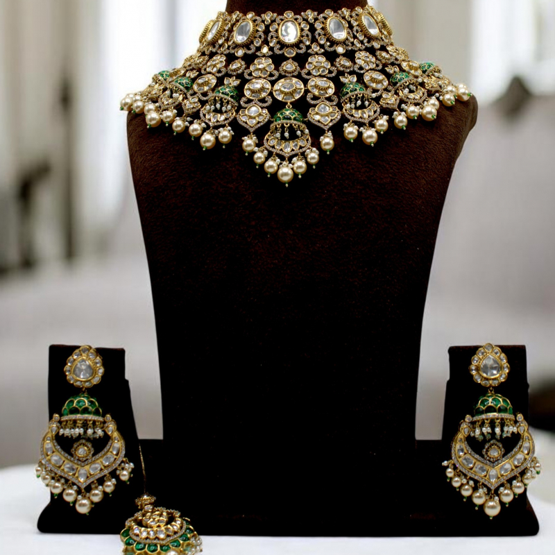 The necklace is beautifully detailed with emerald green enamel dome accents and finished with elegant pearl drop hangings that add movement and richness. The matching statement earrings mirror the choker’s regal craftsmanship, and the coordinated maang tikka completes the royal ensemble.