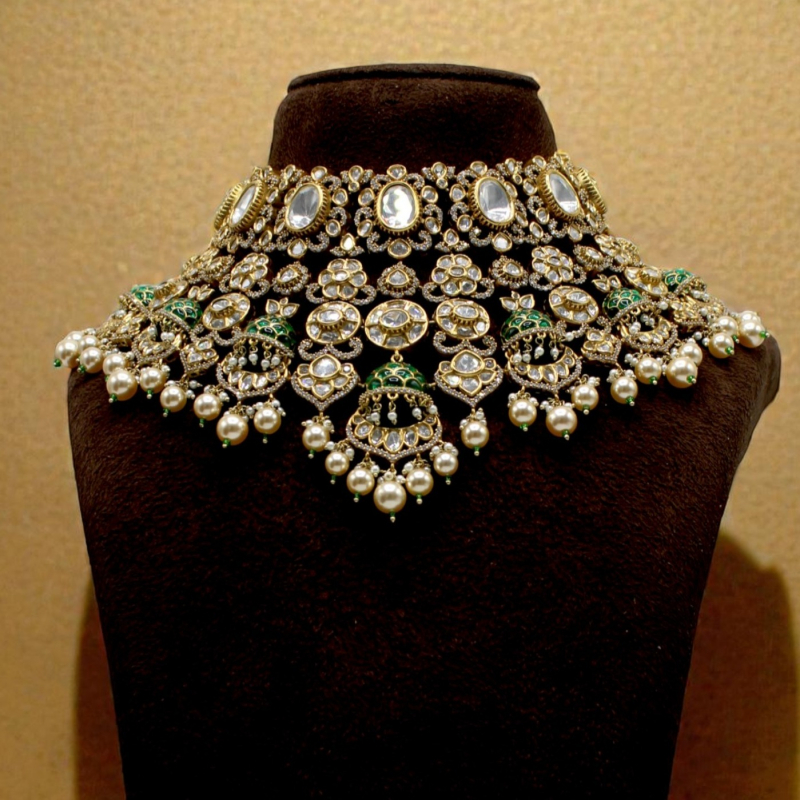 Elevate your bridal and festive look with this breathtaking Royal Emerald Kundan Pearl Bridal Choker Set. Designed in a grand traditional style, this statement choker features layered Kundan (Polki-style) stones intricately set in an antique gold base.