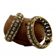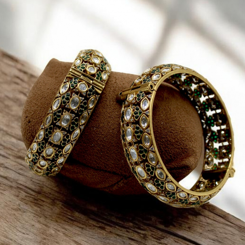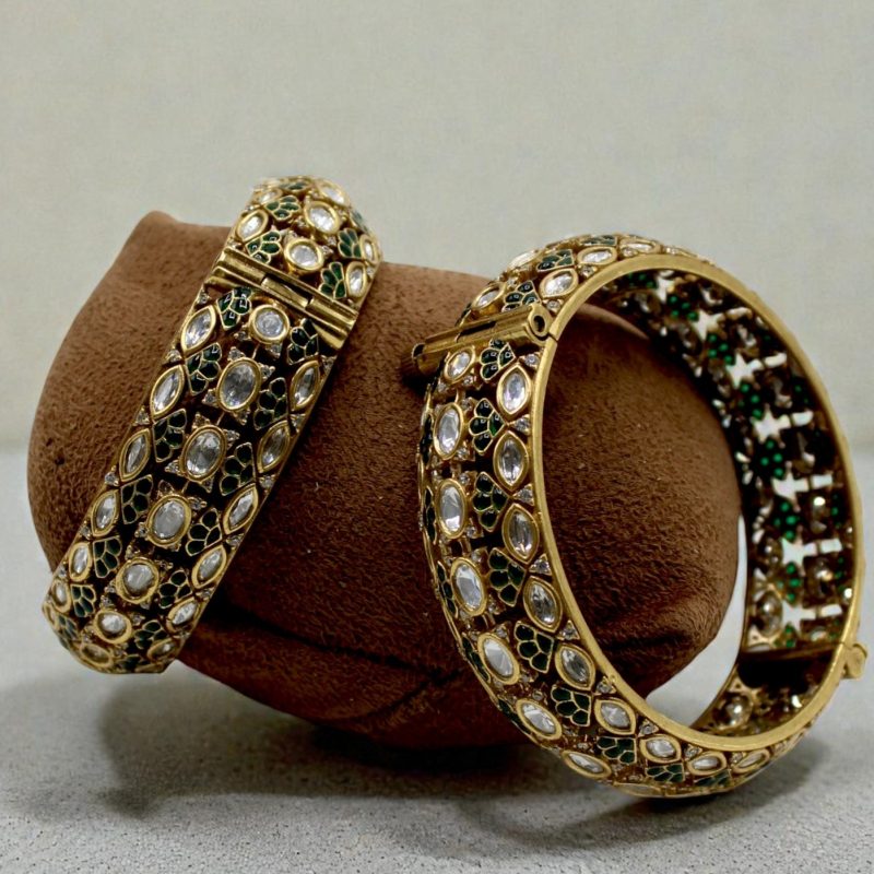 An opulent pair of broad heritage bangles crafted with intricate jaali detailing and traditional polki stone settings. The design features marquise and oval-shaped clear stones arranged in a symmetrical pattern, beautifully highlighted with deep green meenakari (enamel) work. Finished in a rich antique gold polish, these bangles exude royal elegance and are perfect for bridal and festive wear.