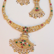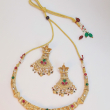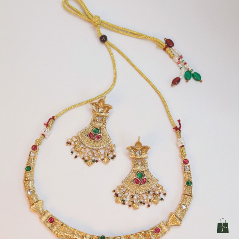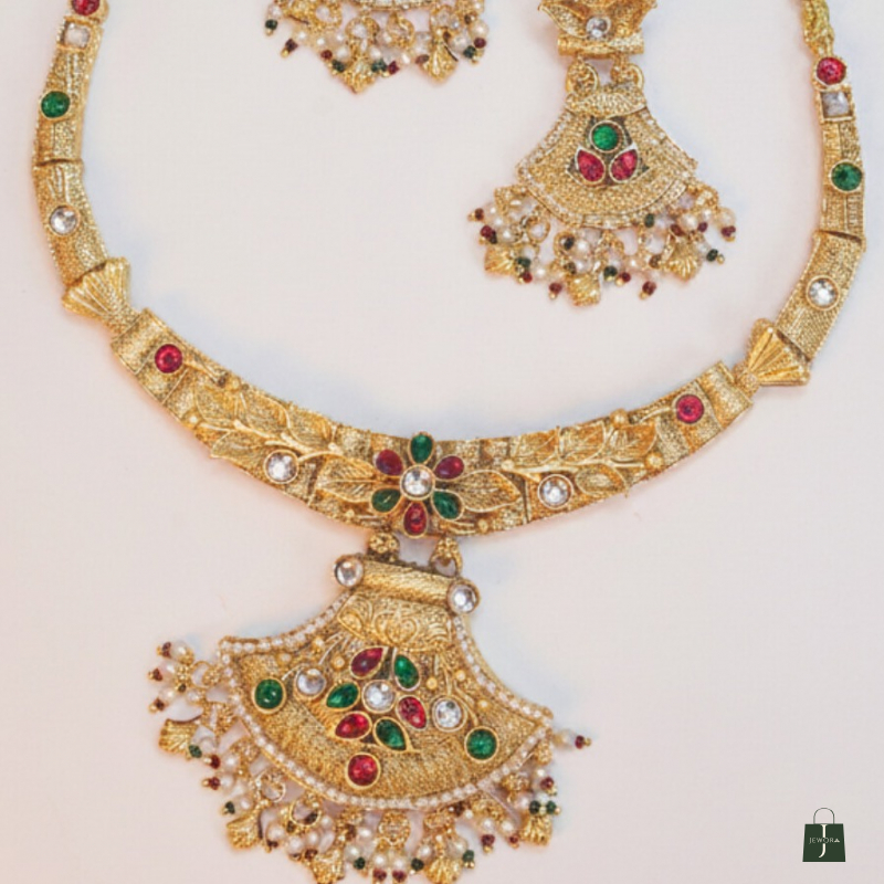Command attention with the Royal Fan-Medallion Choker Set, a stunning blend of antique artistry and bold design. This set features a wide, structured band leading to a magnificent fan-shaped pendant adorned with floral engravings and ruby and emerald-colored stones. Finished with delicate seed-pearl droplets and matching statement earrings, itβs the ultimate choice for a majestic festive look.