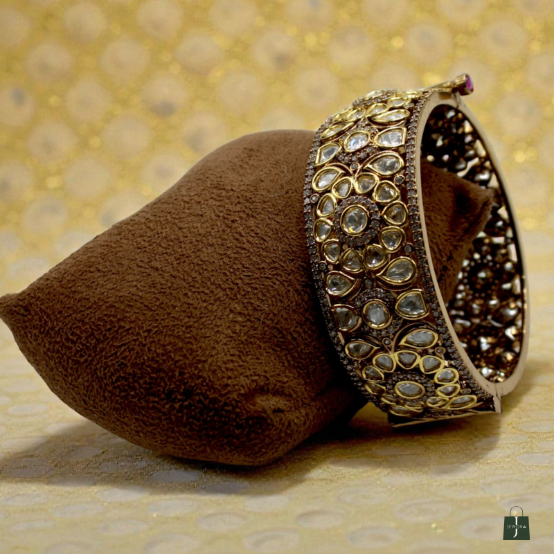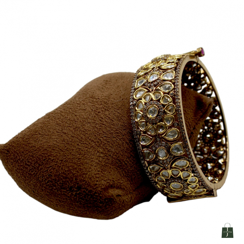 Elevate your ethnic jewellery collection with this exquisite Floral Polki Kundan Statement Bangle, designed with intricate craftsmanship and timeless elegance. The broad surface is beautifully adorned with teardrop and oval-shaped white polki stones arranged in floral clusters, giving it a luxurious royal appeal.