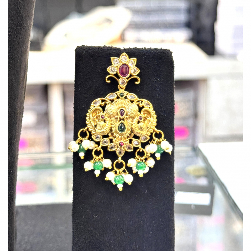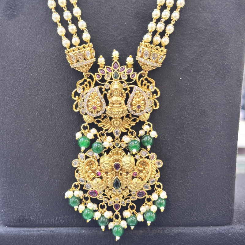 The double-layer pearl strands combined with the grand pendant and matching earrings bring together heritage artistry and luxurious craftsmanship. Perfect for brides and women who embrace tradition, the Royal Ganesha Pearl Temple Haar symbolizes prosperity and grace, ensuring you shine with cultural pride at every celebration.