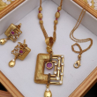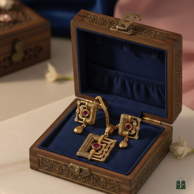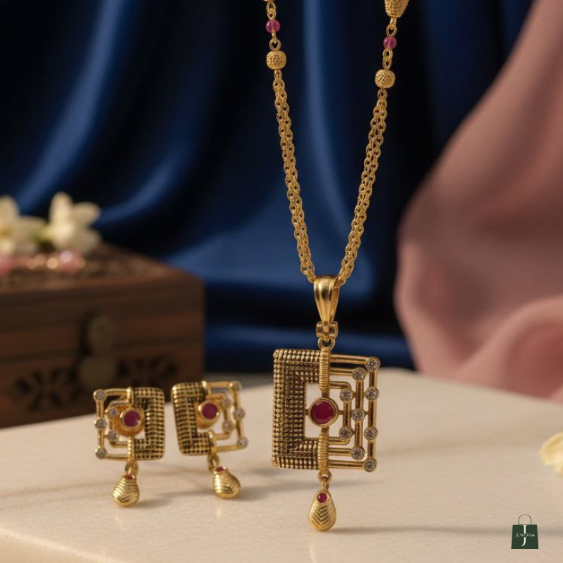 The Royal Geometric Kundan Pendant Necklace Set is a premium ethnic jewellery set designed with a bold square geometric motif. Crafted with fine detailing and finished in rich antique gold polish, this set features deep ruby-red kundan stones surrounded by textured metal work and subtle crystal accents.