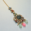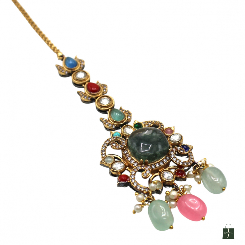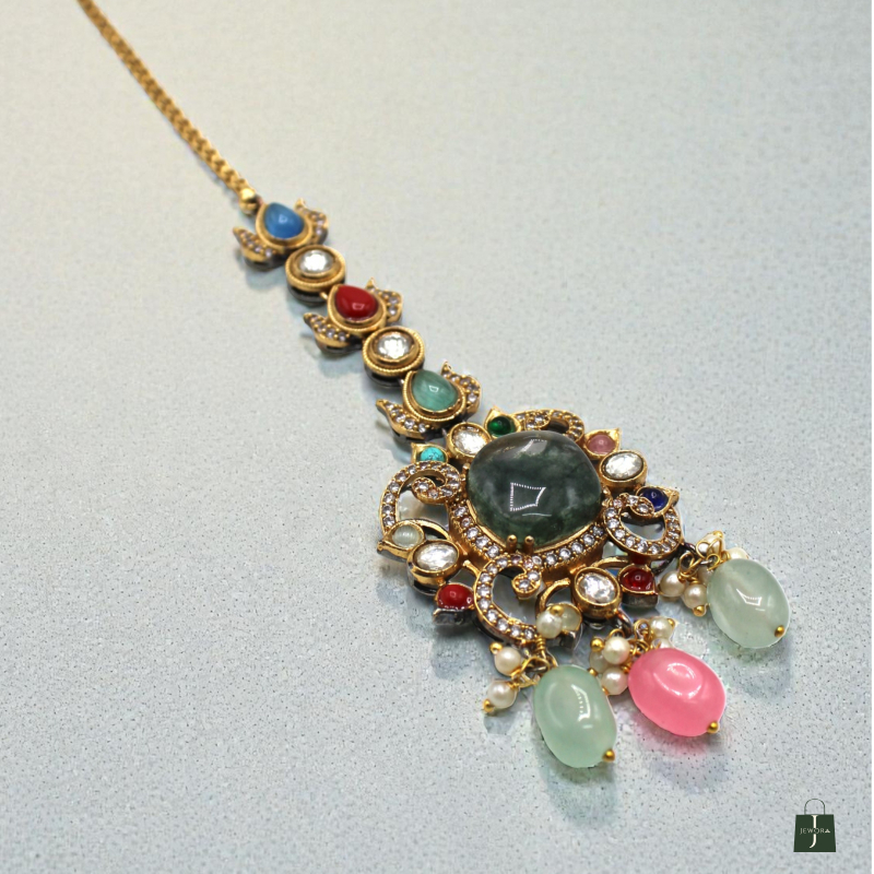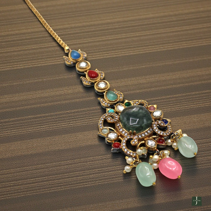 Enhance your festive and bridal look with this beautifully crafted Royal Green Cabochon Navratna Maang Tikka. The centerpiece features a bold deep green oval cabochon stone, elegantly surrounded by sparkling white kundan-style stones and vibrant multi-colour accents.