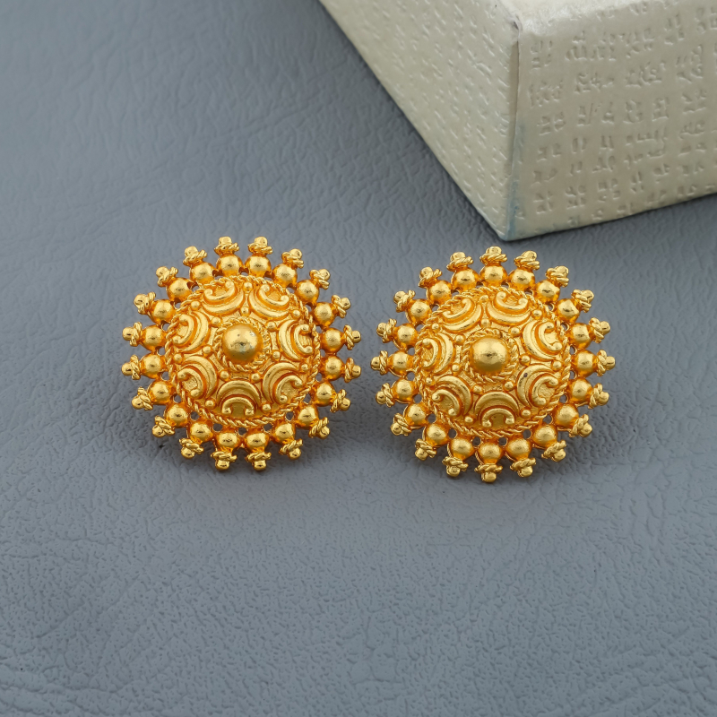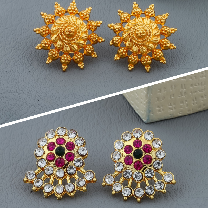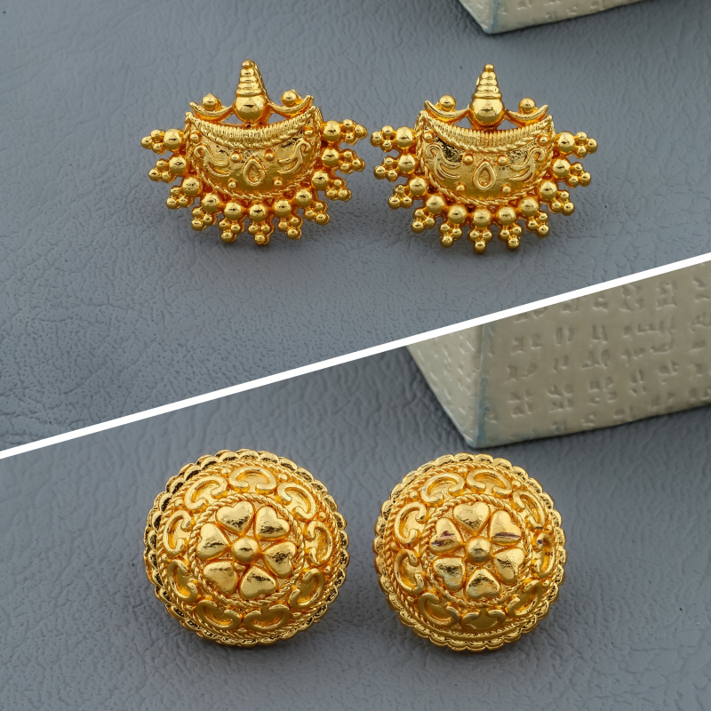 Elevate your ethnic jewellery collection with the elegant Royal Heritage Gold Earrings Combo. This beautifully curated set features five unique traditional designs, including sparkling floral stone studs, radiant sunburst antique patterns, classic engraved dome studs, temple-inspired half-moon earrings with delicate bead detailing, and intricate circular heritage motifs. Finished with a rich gold-tone polish, each pair reflects timeless craftsmanship and festive charm. Perfect for weddings, celebrations, and traditional outfits, this versatile combo allows you to style different looks for every occasion while maintaining a graceful ethnic appeal.