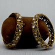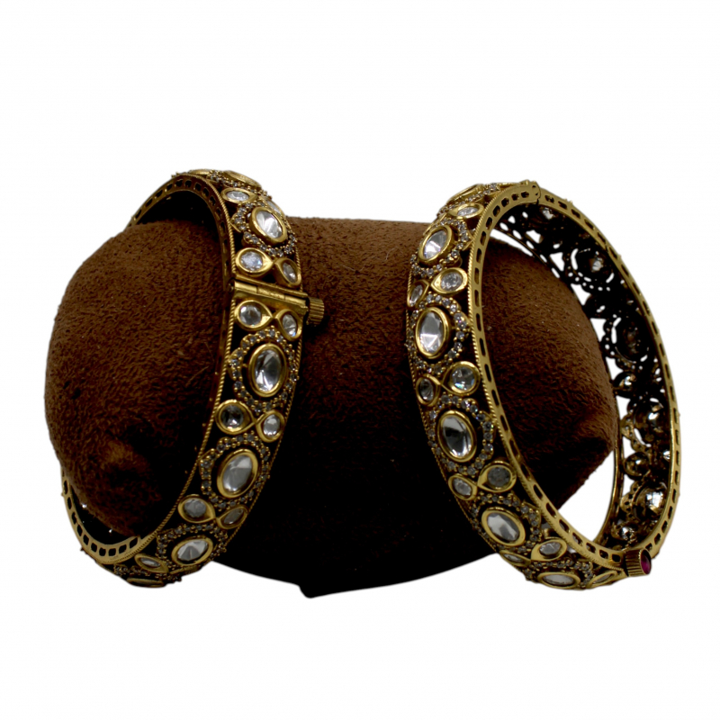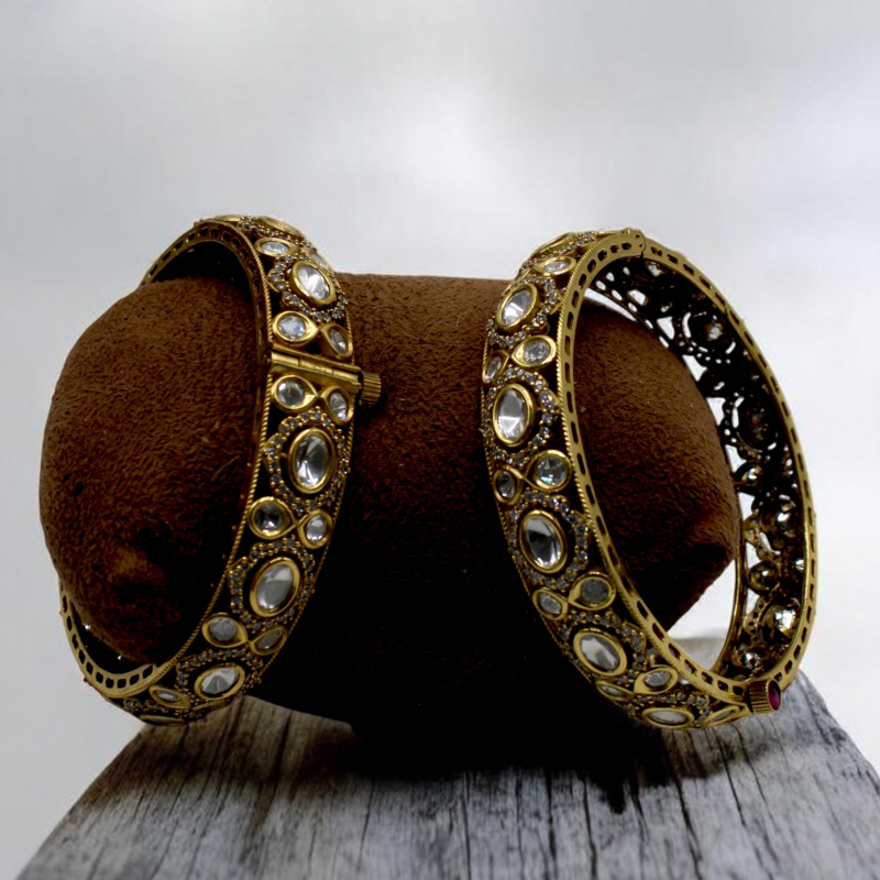 Elevate your traditional jewelry collection with these exquisitely crafted antique gold kada bangles. Designed with timeless elegance, these bangles feature beautifully set ivory-toned Kundan stones arranged in an intricate symmetrical pattern.