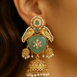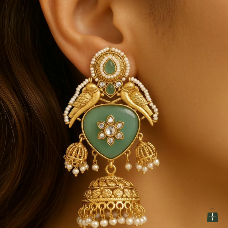 These Royal Kashmiri Earrings are handcrafted with ornate motifs, traditional kundan-style stones, and delicate pearl embellishments. The bold centerpiece is beautifully balanced with classic jhumka drops, creating a royal yet elegant silhouette.