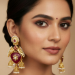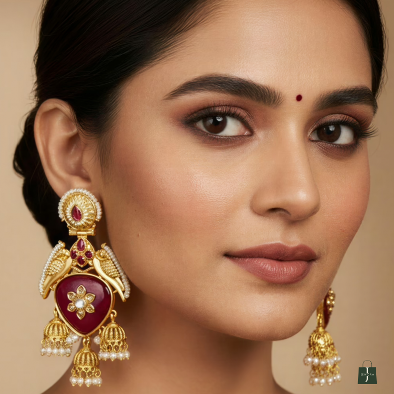 These Royal Kashmiri Earrings are handcrafted with ornate motifs, traditional kundan-style stones, and delicate pearl embellishments. The bold centerpiece is beautifully balanced with classic jhumka drops, creating a royal yet elegant silhouette.