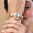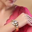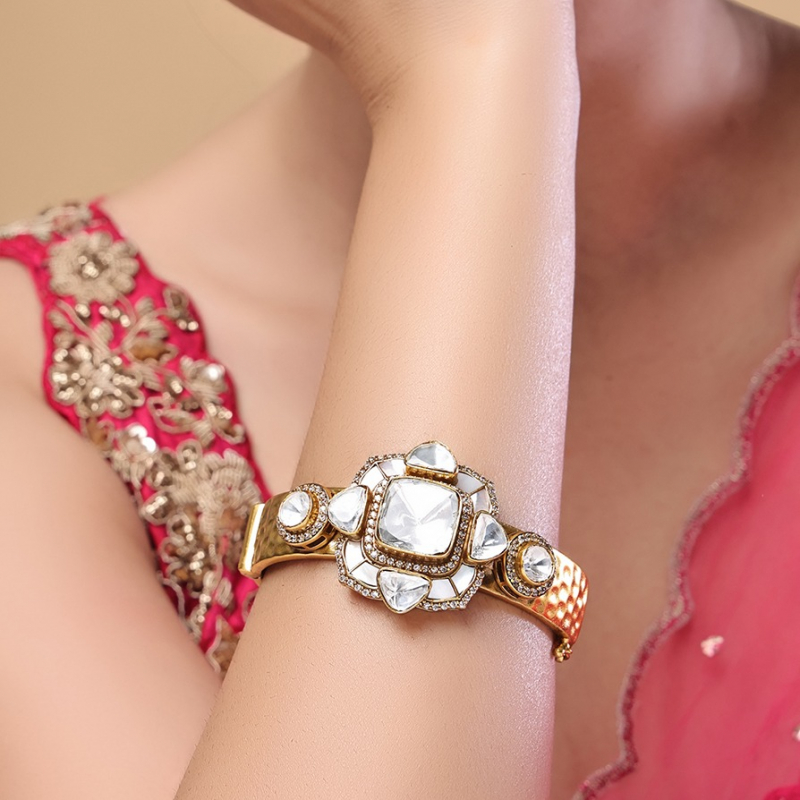 Add a touch of timeless elegance to your look with this beautifully crafted statement kada. Featuring a stunning floral motif at the center, this piece is adorned with high-quality kundan stones that reflect grace and luxury. The textured gold-tone band enhances its traditional appeal while maintaining a modern statement style. Perfect for weddings, festive occasions, or ethnic wear styling.