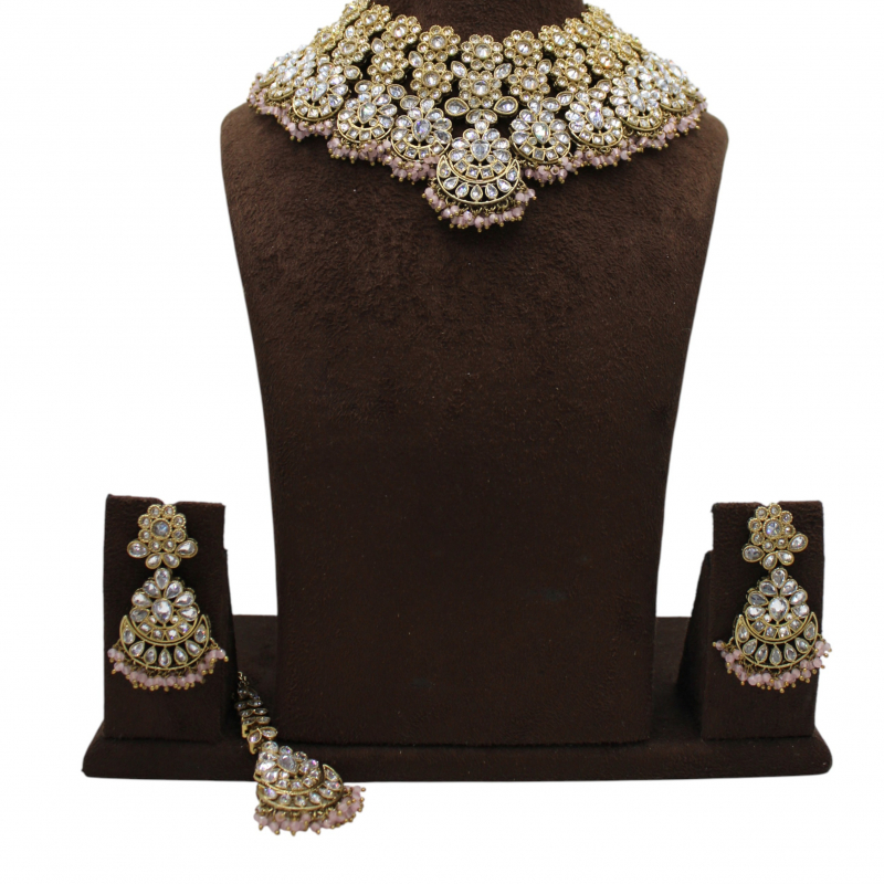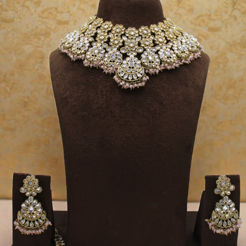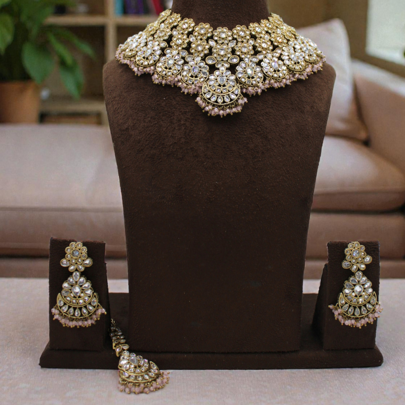 Add timeless elegance to your jewellery collection with this stunning Kundan Pearl Bridal Choker Set. Designed with intricate floral patterns, this statement choker features premium white Kundan stones beautifully set in antique gold polish and enhanced with delicate soft pink pearl bead drops.