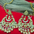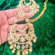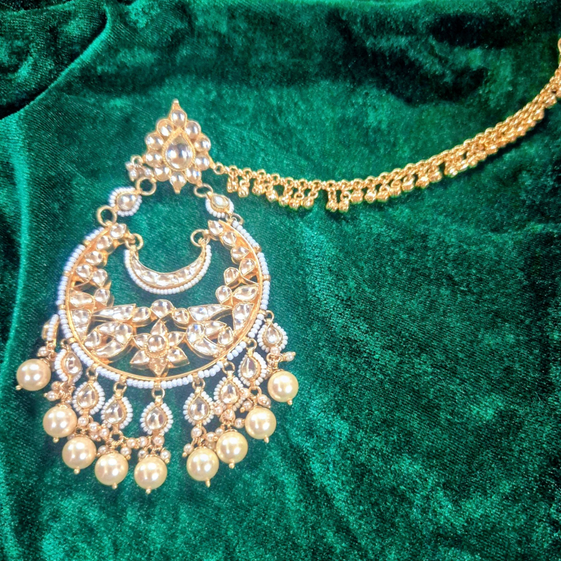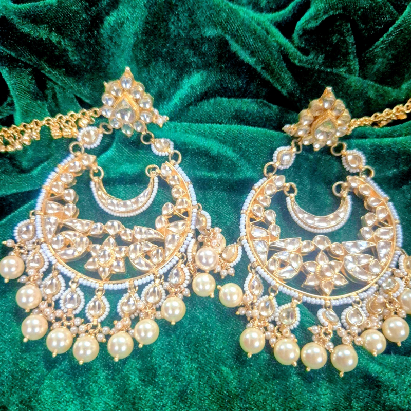 Elevate your ethnic look with these stunning royal Kundan chandbali earrings, paired with an elegant chain for added support and style. Featuring intricate crescent-shaped detailing adorned with shimmering Kundan stones, these earrings are beautifully finished with delicate pearl danglings that add graceful movement. The rich gold-tone polish enhances their regal appeal, making them perfect for weddings, festive occasions, and traditional celebrations. A timeless piece that blends heritage craftsmanship with luxurious elegance.