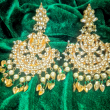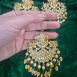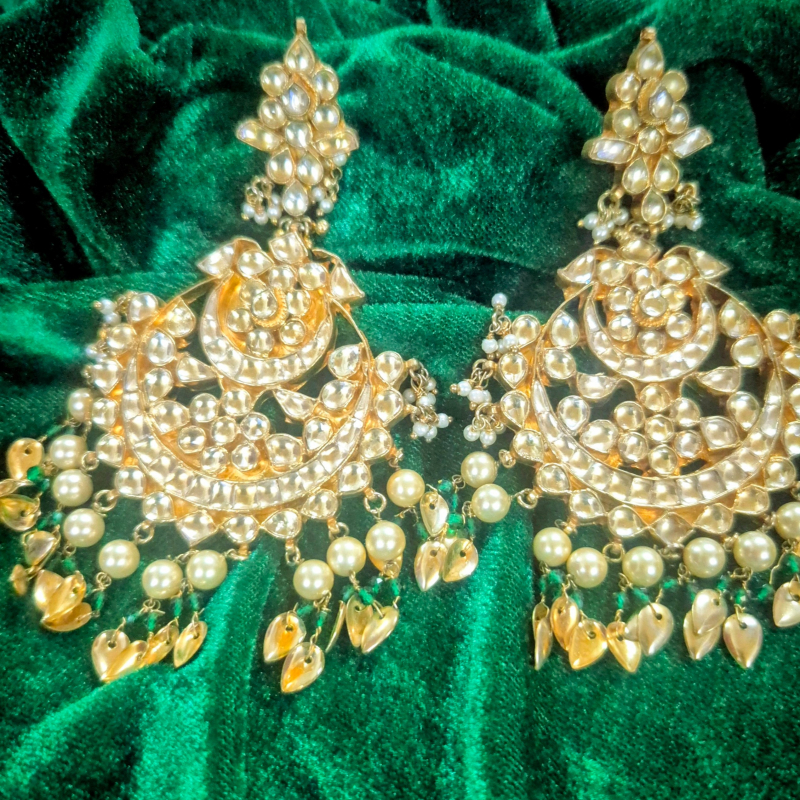 Step into regal elegance with this stunning Kundan Chandbali set, featuring intricately crafted earrings paired with a matching maang tikka. Designed with layered crescent (chandbali) patterns, the set is adorned with sparkling Kundan stones and finished with delicate pearl and gold bead danglings. The rich gold-tone polish enhances its royal appeal, making it a perfect choice for weddings, festive occasions, and traditional celebrations. This statement set beautifully blends heritage craftsmanship with timeless beauty.