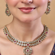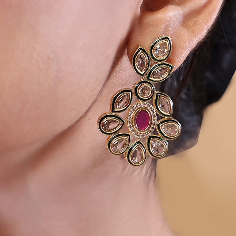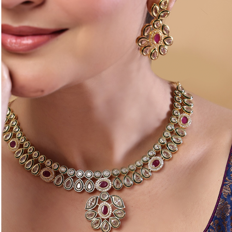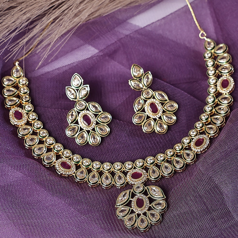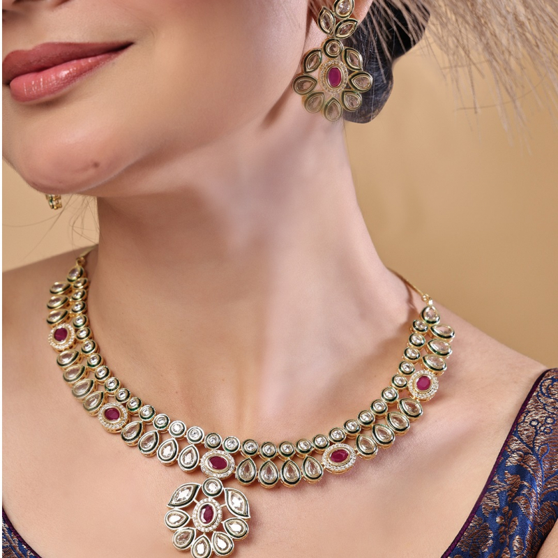 Elevate your ethnic look with this exquisite Royal Kundan Ruby jewelry set, designed to reflect regal elegance and traditional artistry. The necklace features a graceful arrangement of kundan-style stones highlighted with deep ruby accents, finished with a stunning statement pendant. Paired with intricately designed matching earrings, this set is perfect for weddings, festive occasions, and grand celebrations. Its luxurious gold-tone finish and detailed craftsmanship make it a must-have for anyone who loves classic royal aesthetics.