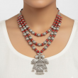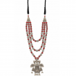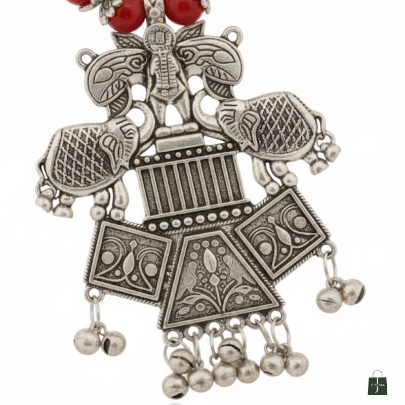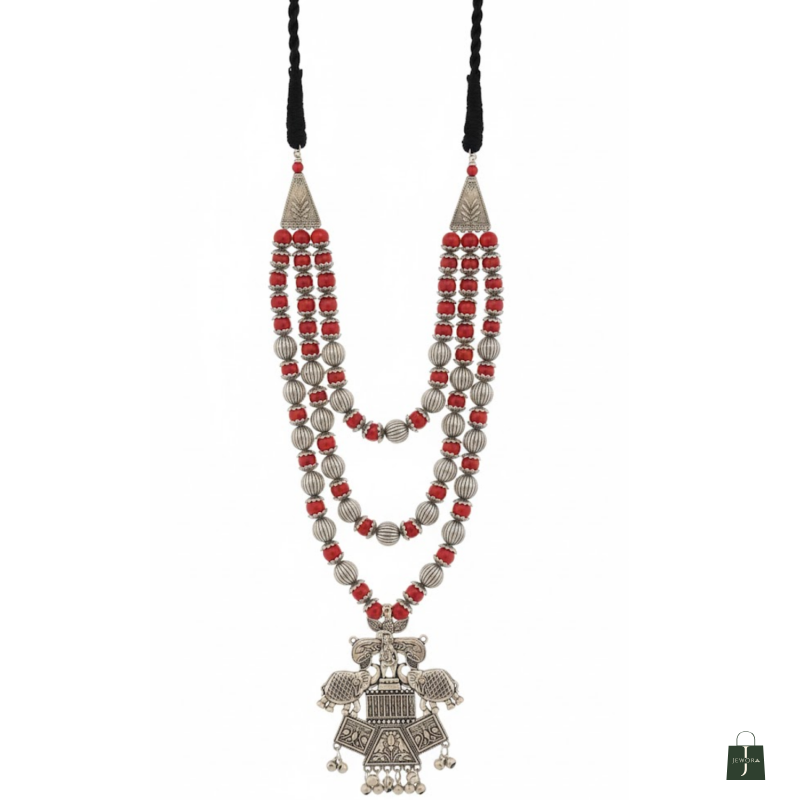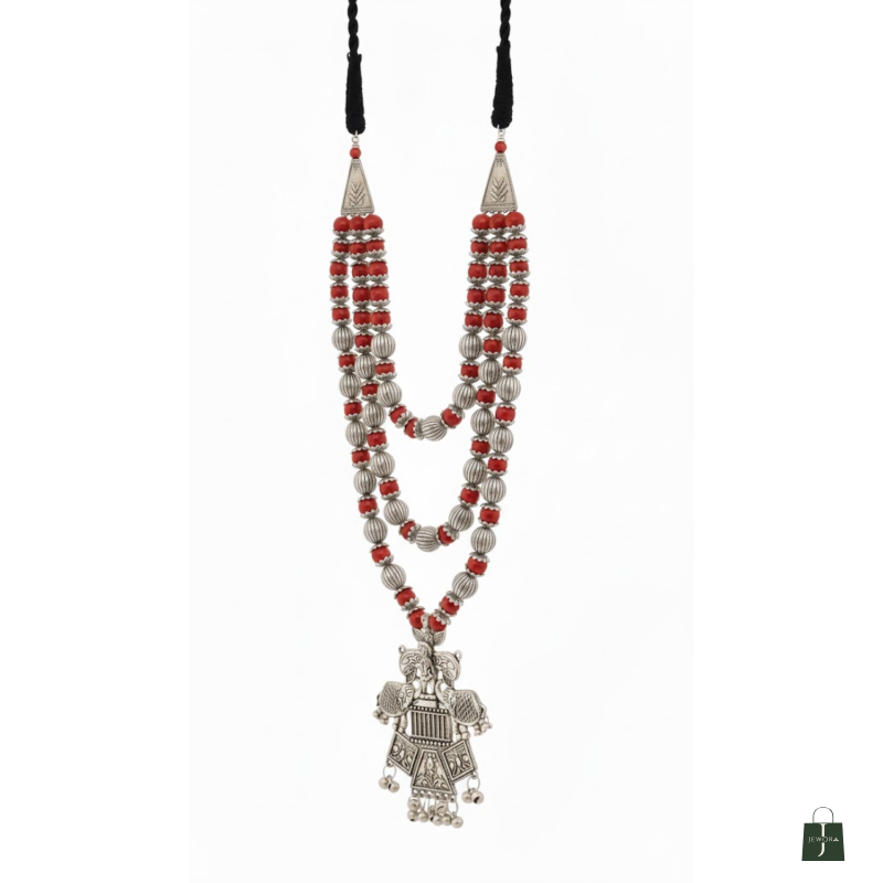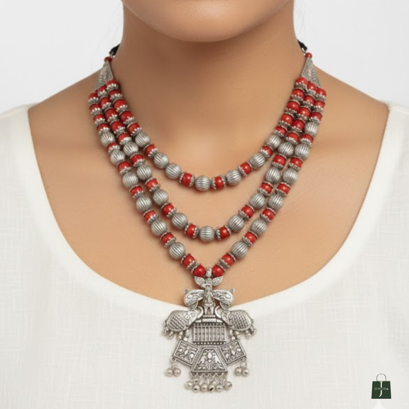 A majestic triple-layer oxidised necklace adorned with red handcrafted beads and a grand tribal pendant inspired by Kutch artistry. A true statement piece that effortlessly elevates any ethnic or fusion look.