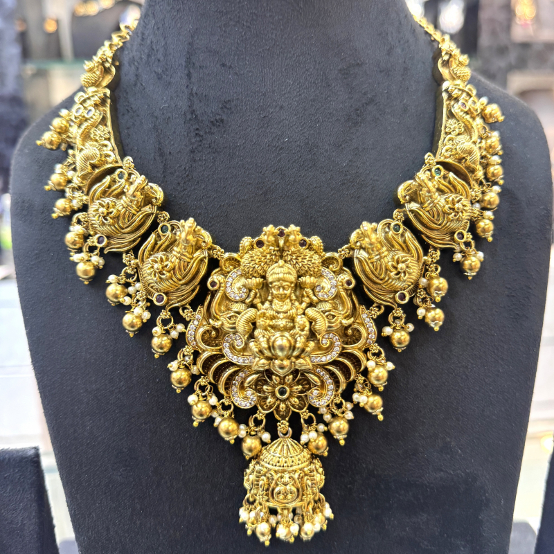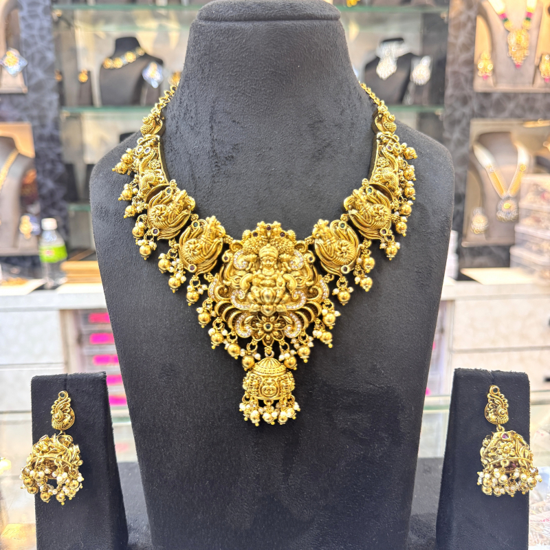 Discover the timeless beauty of the Royal Lakshmi Temple Haar by Jewora, an exquisite masterpiece of traditional craftsmanship. This bridal necklace set is inspired by the rich heritage of temple jewelry, featuring intricate carvings of Goddess Lakshmi, adorned with golden motifs, pearls, and detailed filigree artistry. The set comes with a beautifully matching pair of earrings, making it the perfect choice for brides and women who seek to embrace divine elegance on special occasions.
