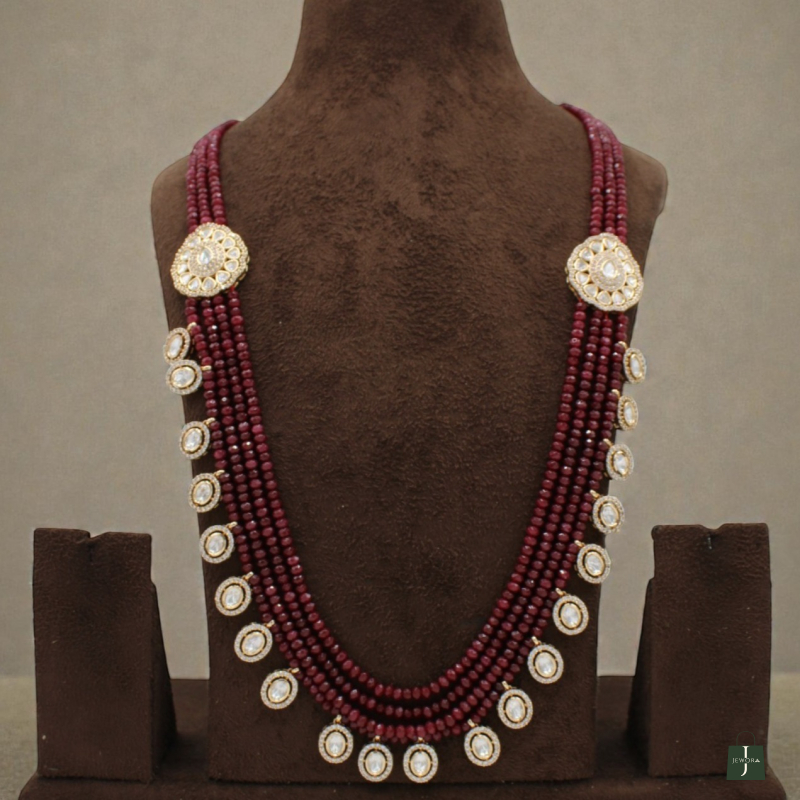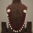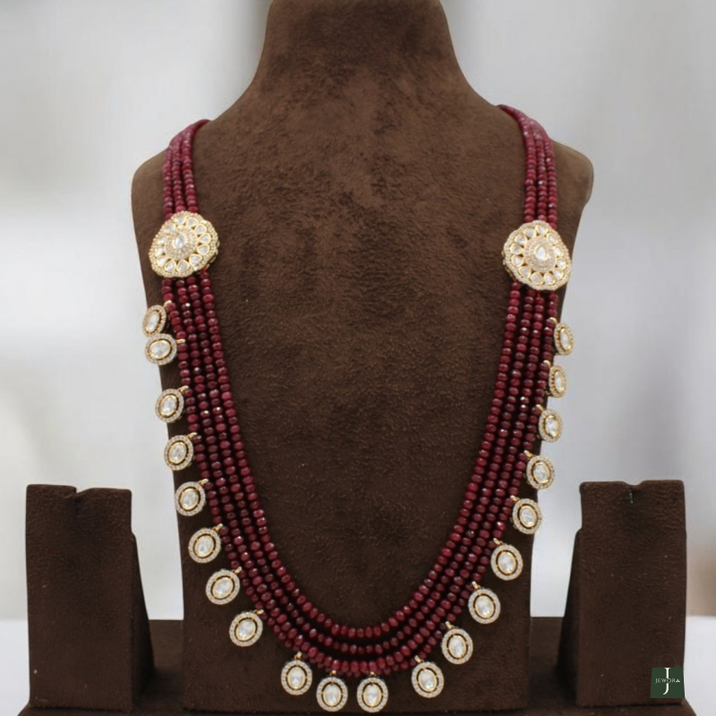 Add a touch of royal sophistication to your ethnic ensemble with this Royal Maroon Kundan Beaded Long Necklace Set. Designed with multiple strands of deep maroon beads, this elegant piece is beautifully highlighted with round Kundan stone motifs placed gracefully along the neckline.