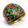 A vibrant, semi-precious stone or enamel ring shaped like a rounded dome . The top surface is with an intricate floral inlay of red, blue, black and pink petals outlined in gold filigree. The side edge has squares with gold detailing, giving it a luxurious, ethnic look. Ideal for ethnic jewellery collections.