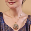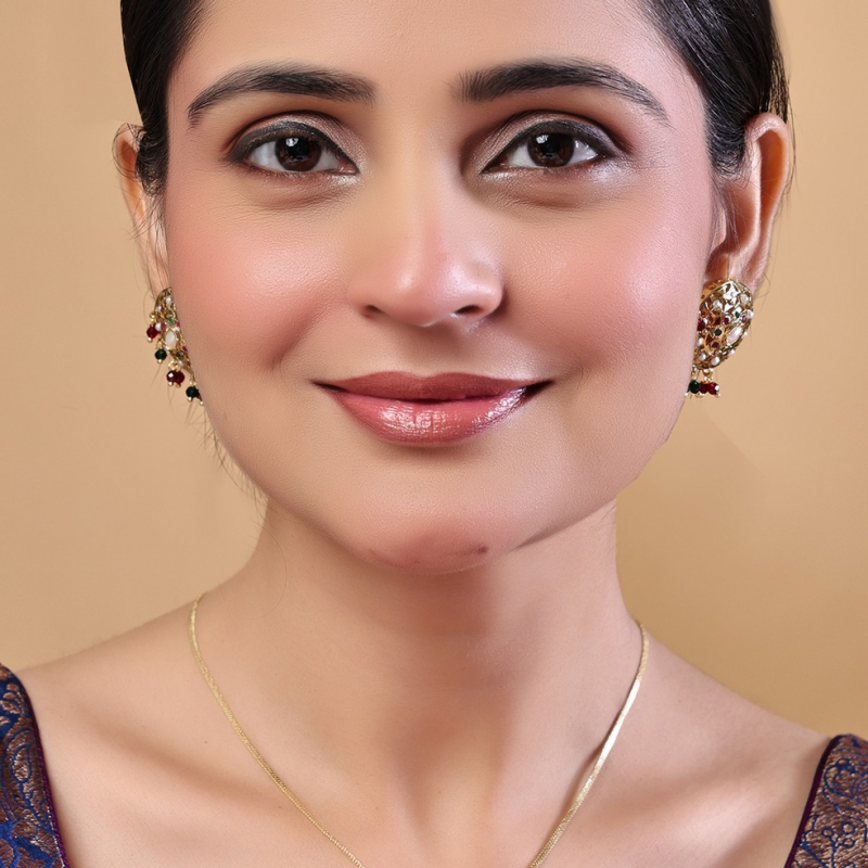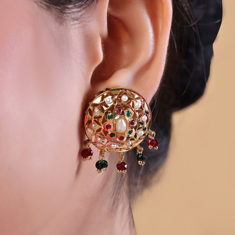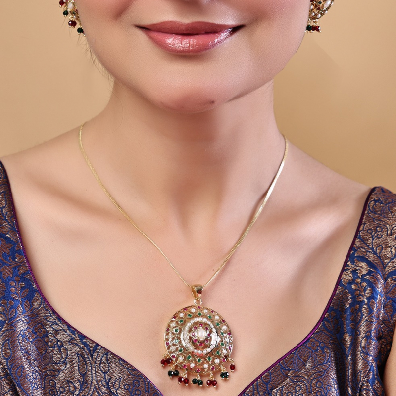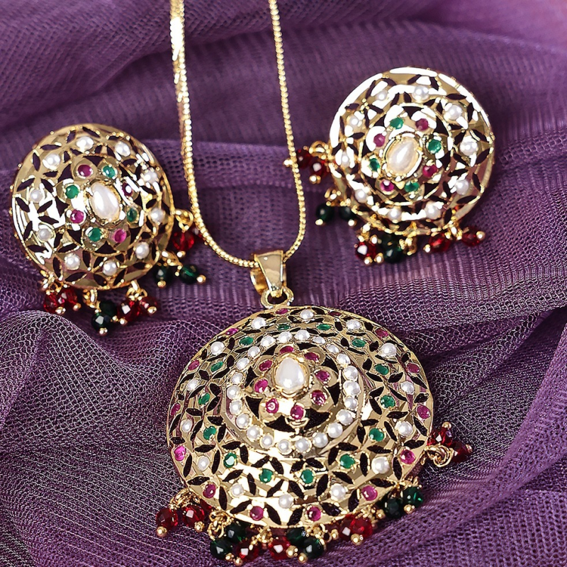 Add a touch of traditional elegance to your look with this beautifully crafted meenakari pendant set. Featuring intricate gold-toned filigree work, the set is adorned with delicate white pearls and vibrant red and green stones. The circular pendant and matching stud earrings are enhanced with dangling bead accents, making it perfect for festive occasions, weddings, and ethnic wear styling.