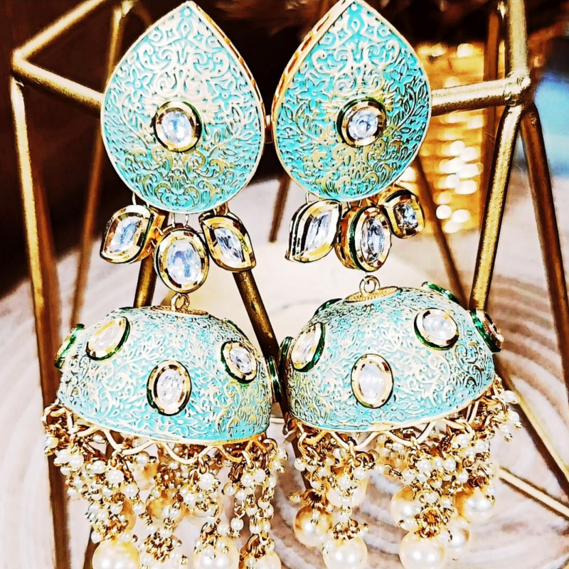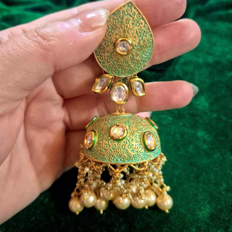 Step into timeless elegance with the Royal Mint Kundan Pearl Jhumka Earrings, a stunning piece inspired by traditional bridal artistry. Featuring a beautiful mint green enamel base with intricate golden detailing, these earrings are adorned with radiant white kundan-style stones that add a luxurious sparkle. The dome-shaped jhumka is gracefully enhanced with cascading pearl drops and delicate bead chains, creating a rich and royal look. Perfect for weddings, festive occasions, and ethnic wear, these earrings effortlessly elevate your outfit with their vibrant color and intricate craftsmanship, making you shine with elegance and grace.