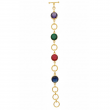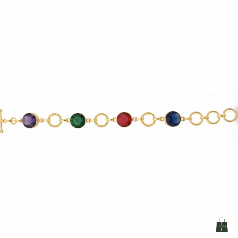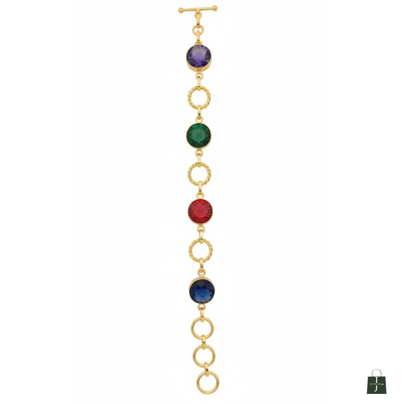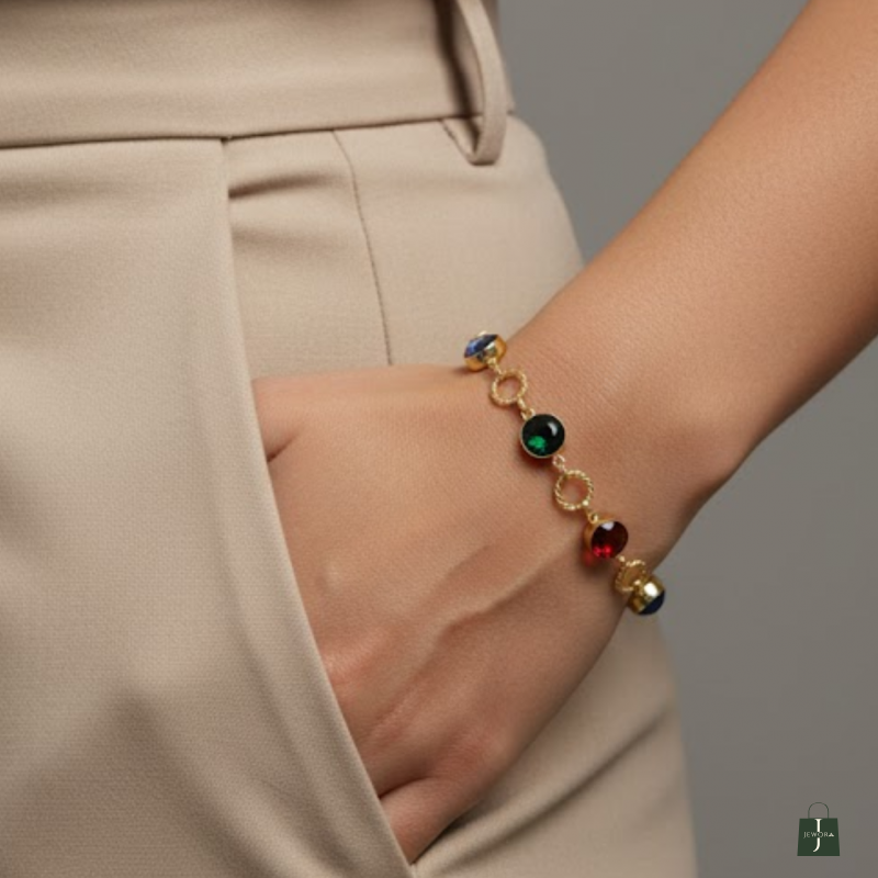 A vibrant bracelet featuring rich blue, green, and red faceted crystals paired with textured golden rings. Stylish, lightweight, and perfect for adding colour to any look.