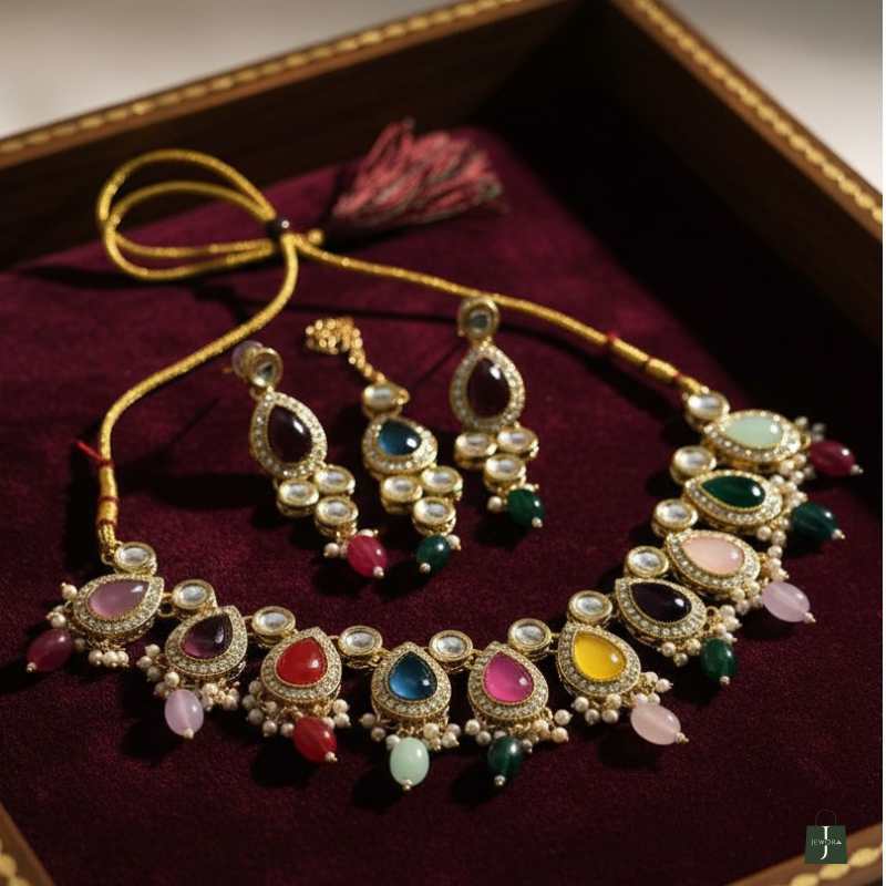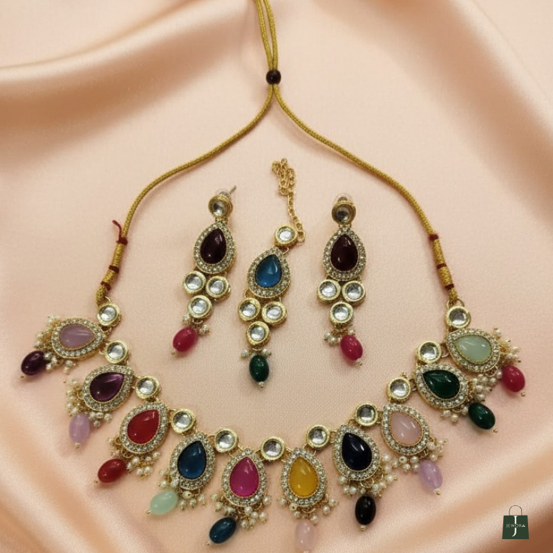 The Royal Navratna Kundan Necklace Set is a magnificent piece inspired by traditional Indian royal jewellery. Crafted with premium brass alloy and finished in rich antique gold polish, this necklace features an exquisite arrangement of Navratna semi-precious stones in vibrant multicolor shades. Each teardrop-shaped stone is beautifully surrounded by sparkling white kundan polki, giving the necklace a luxurious and heritage appeal.