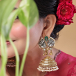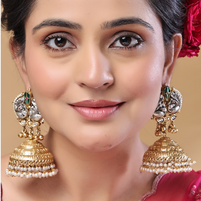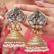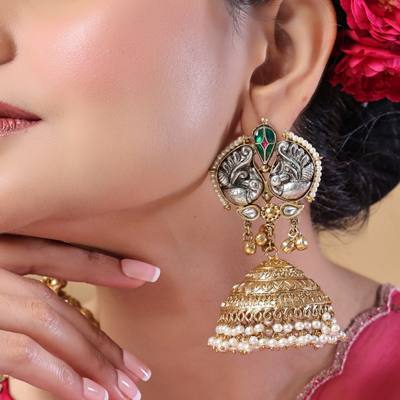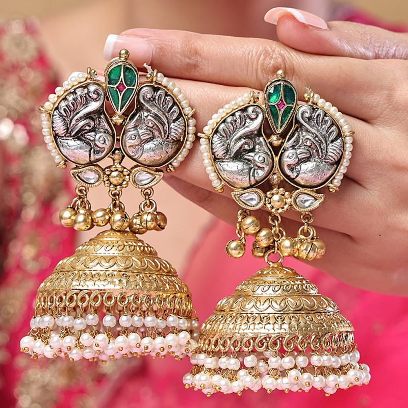 Elevate your ethnic look with these exquisitely crafted Royal Peacock Heritage Jhumka Earrings. Inspired by traditional Indian artistry, these statement earrings feature intricately detailed peacock motifs paired with a grand dome-shaped jhumka. The fusion of antique silver-toned detailing with rich gold polish creates a regal contrast, while delicate pearl hangings add graceful movement and charm. Perfect for weddings, festive occasions, and cultural celebrations, these earrings beautifully blend heritage craftsmanship with timeless elegance.